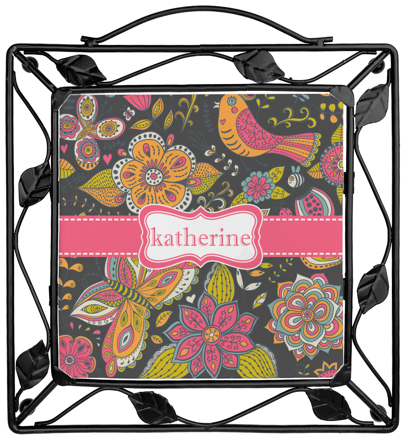 Our square trivets are made from a durable, wrought iron. This model features 4 small half circles, one on each corner, and a larger ring of iron that circles the central, customized tile. Each of the 4 corners has a round foot on its bottom for stability. This trivet is 8.75 by 8.75 inches, but the central tile measures at 6 inches on both sides.