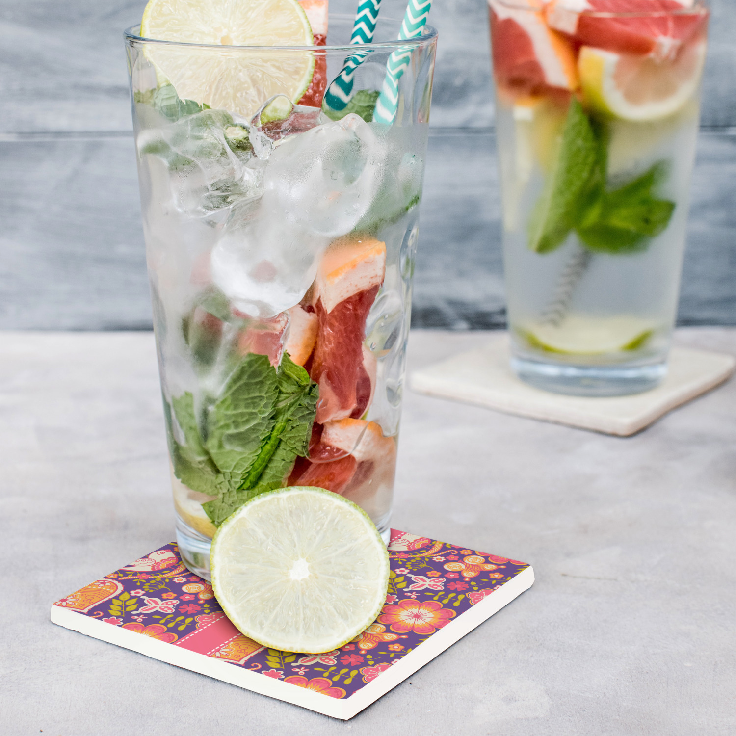 These customized stone coasters are perfect for use with beverages that are served in drinkware that "sweat". When cocktails, sodas, iced tea, water, etc. are served with ice in a regular glasses (non insulated glasses), they release condensation that drips down the outside of the glasses.