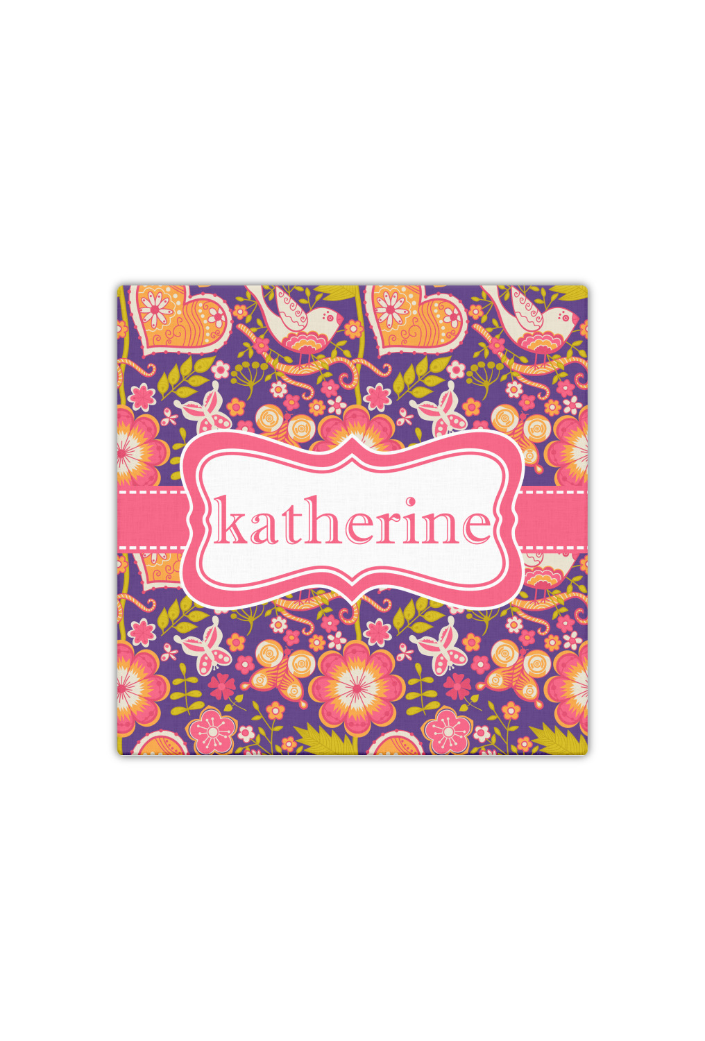 A pink ribbon with white stitching attached to a decorative white label trimmed in pink ties the entire design together. Add personalization of your choice in a coordinating color to make this pattern even more special.