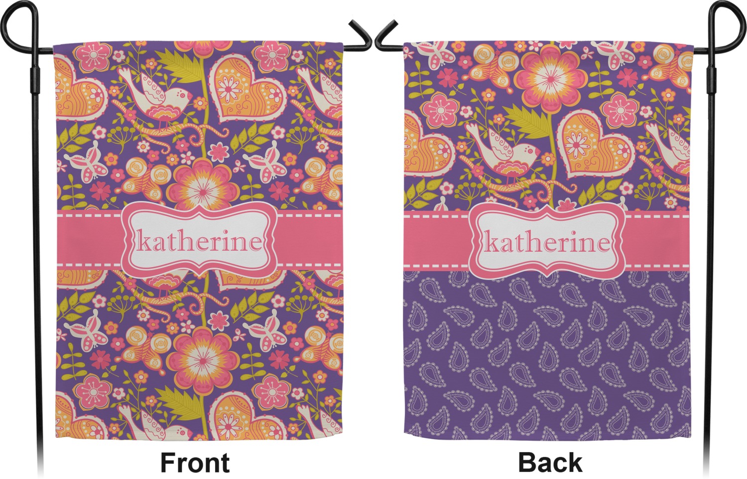 These custom garden flags are made of a durable, double-ply, polyester weave, allowing them to withstand the elements year round. The small flags measure at approximately 12 by 18 inches. The large flags measure out to 28 by 37 inches. You can order these decorative flags with your customization printed on the front only, or the front and back.