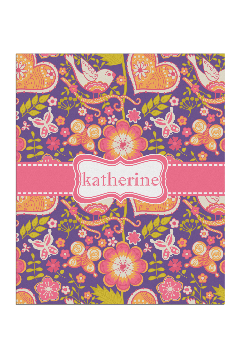 A pink ribbon with white stitching attached to a decorative white label trimmed in pink ties the entire design together. Add personalization of your choice in a coordinating color to make this pattern even more special.