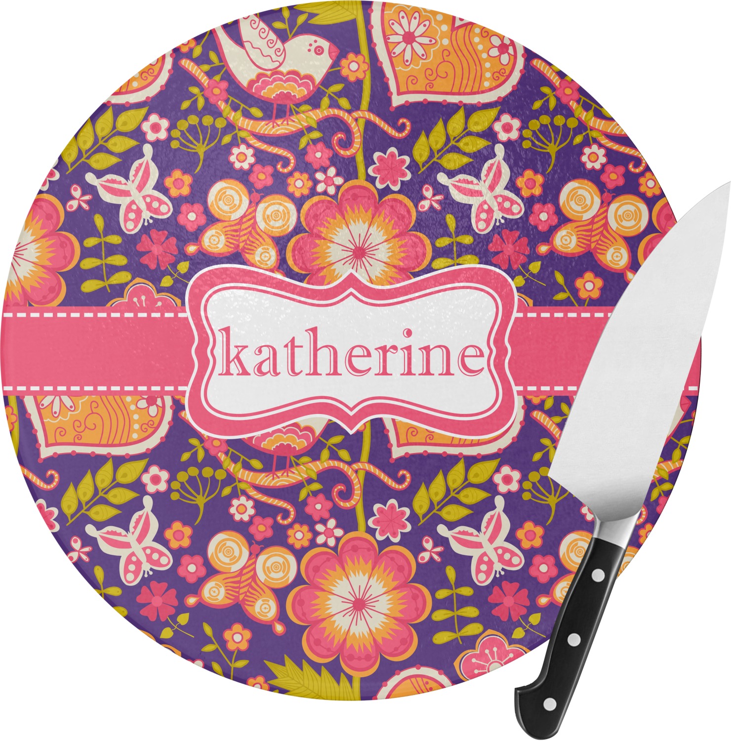 Prep your meals with passion when you use our personalized round cutting boards. The personalization options we offer really make them one of a kind and they are available in delightful colors and designs that might just keep you smiling instead off crying when you're cutting onions!!