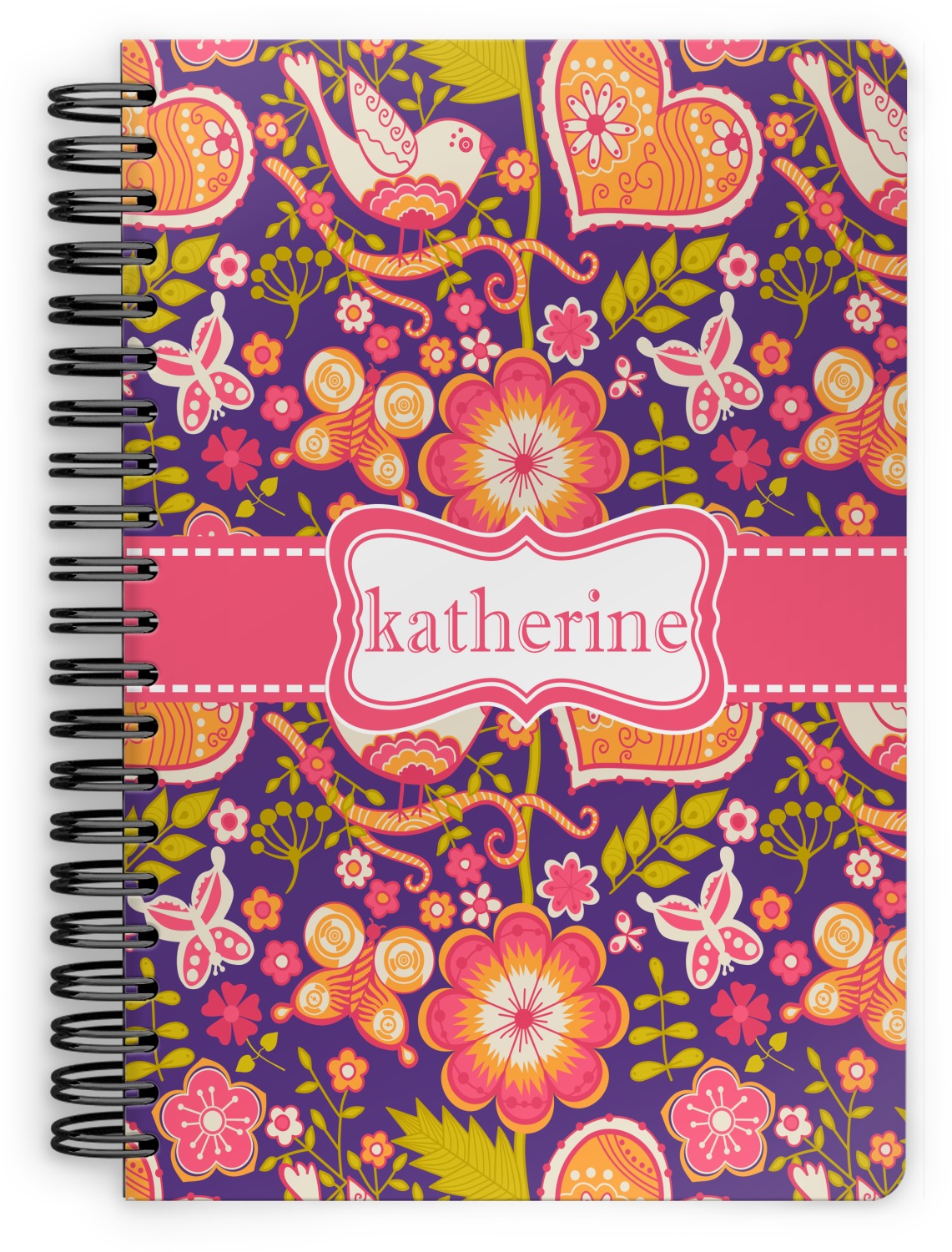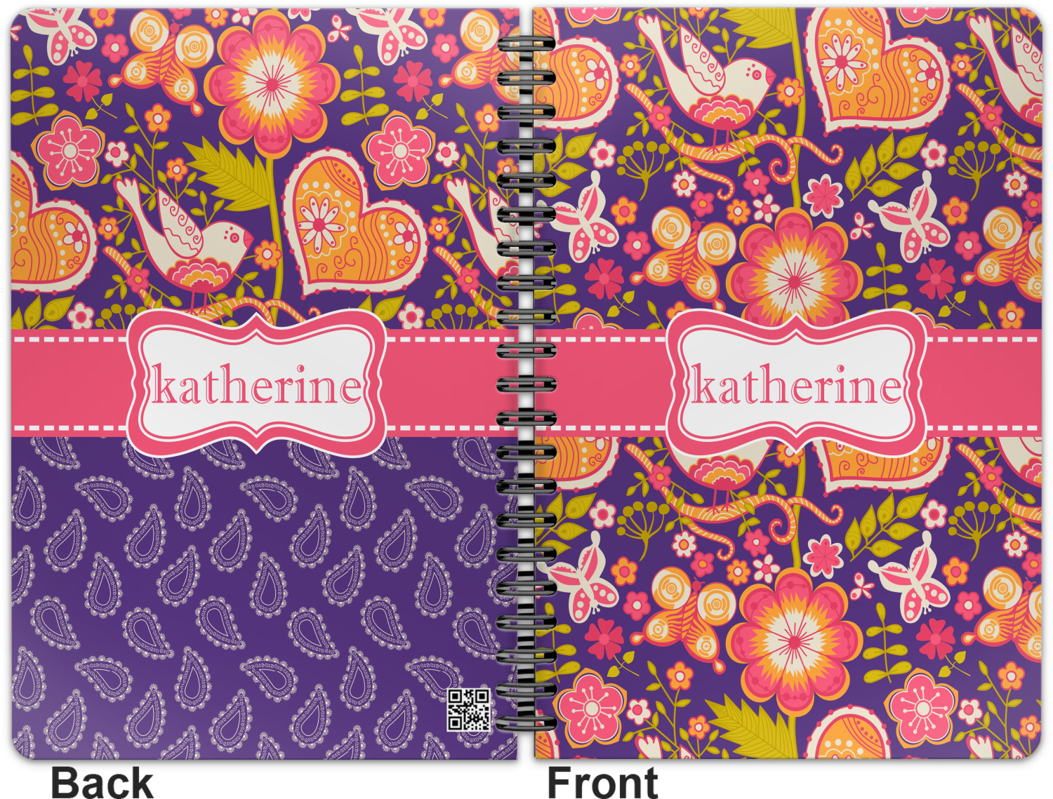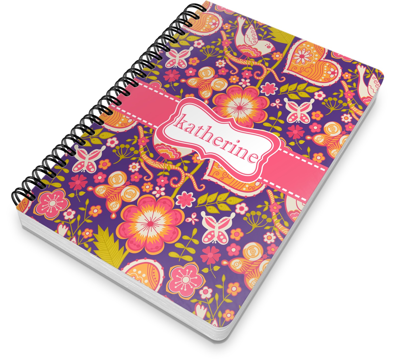 This spiral notebook includes 75 sheets of thick, ruled paper. The front and back of this custom notebook is made of a robust, laminate, plastic covering. We print your personalization on these two panels, underneath a glossy finish, which emphasizes the colors of your design. The two panels and the sheets of paper are held together by a sturdy, black coil. The paper within your bound notebook is perforated for easy, clean tearing.