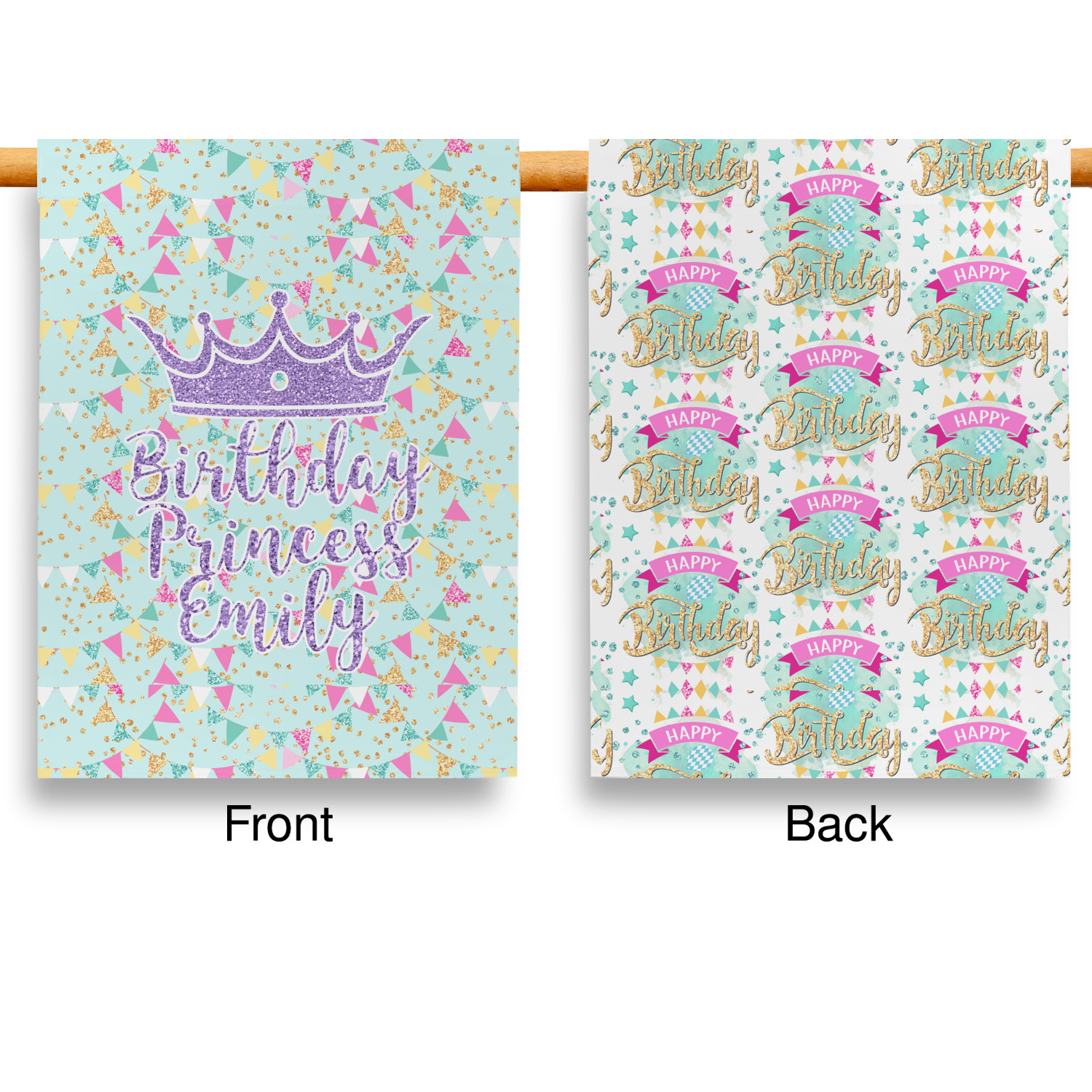 This design is bursting with fun! The background is a cool mint with brightly colored banners and confetti. The main graphic is a quote that says "Birthday Princess [Name Here]." This quote is filled with a fun glittery texture and can easily be changed to other fun patterns and colors.