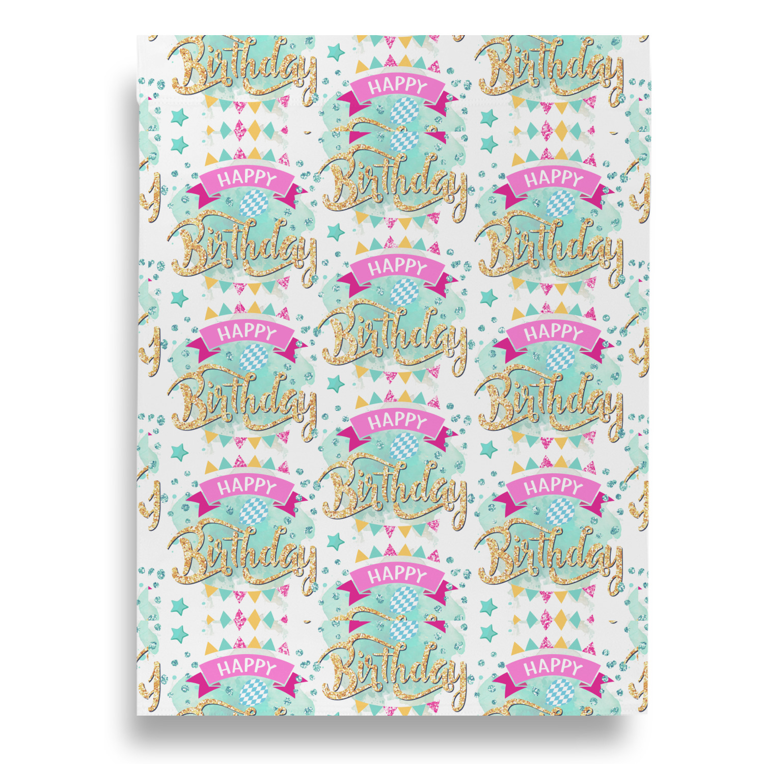 This design is bursting with fun! The background is a cool mint with brightly colored banners and confetti. The main graphic is a quote that says "Birthday Princess [Name Here]." This quote is filled with a fun glittery texture and can easily be changed to other fun patterns and colors.