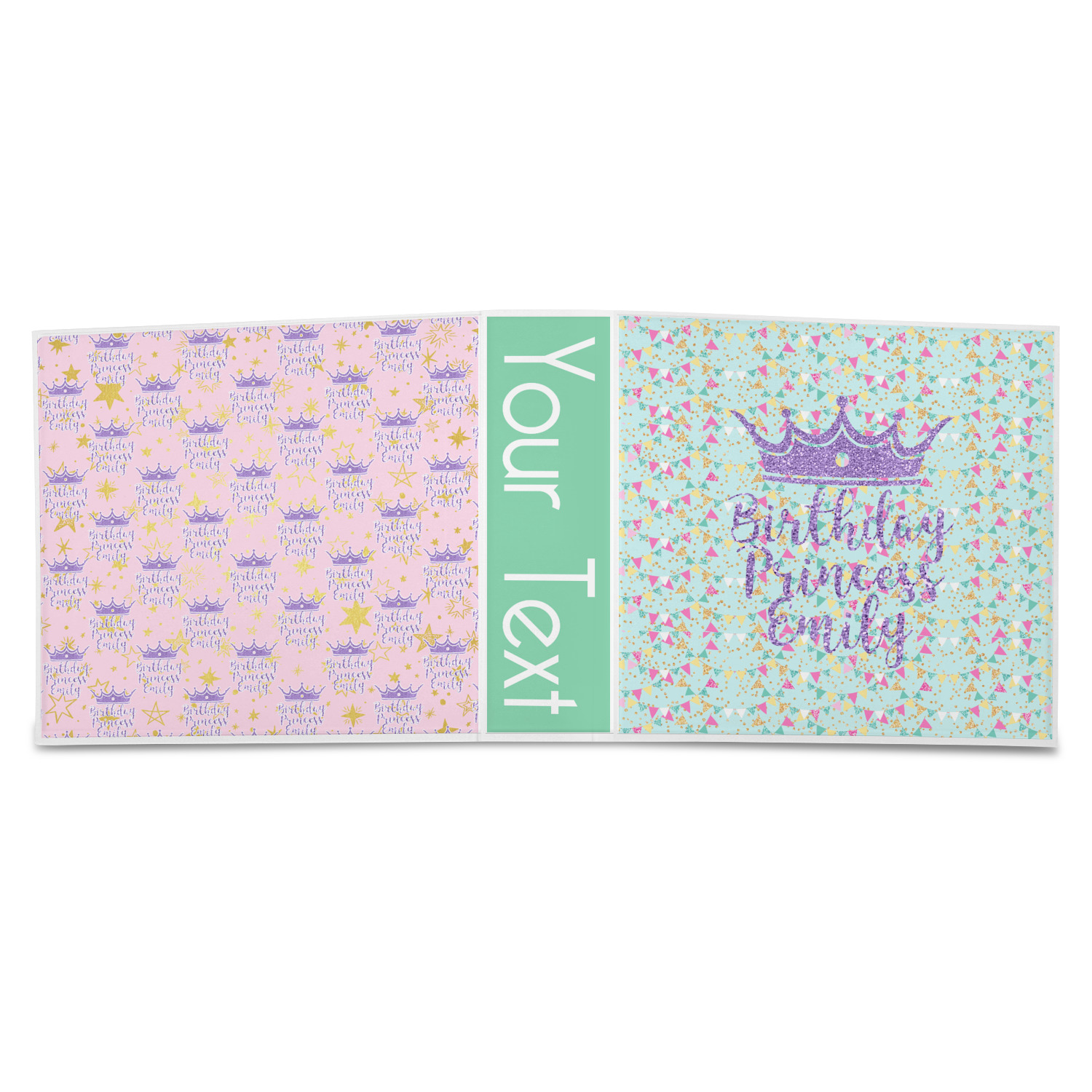 This design is bursting with fun! The background is a cool mint with brightly colored banners and confetti. The main graphic is a quote that says "Birthday Princess [Name Here]." This quote is filled with a fun glittery texture and can easily be changed to other fun patterns and colors.