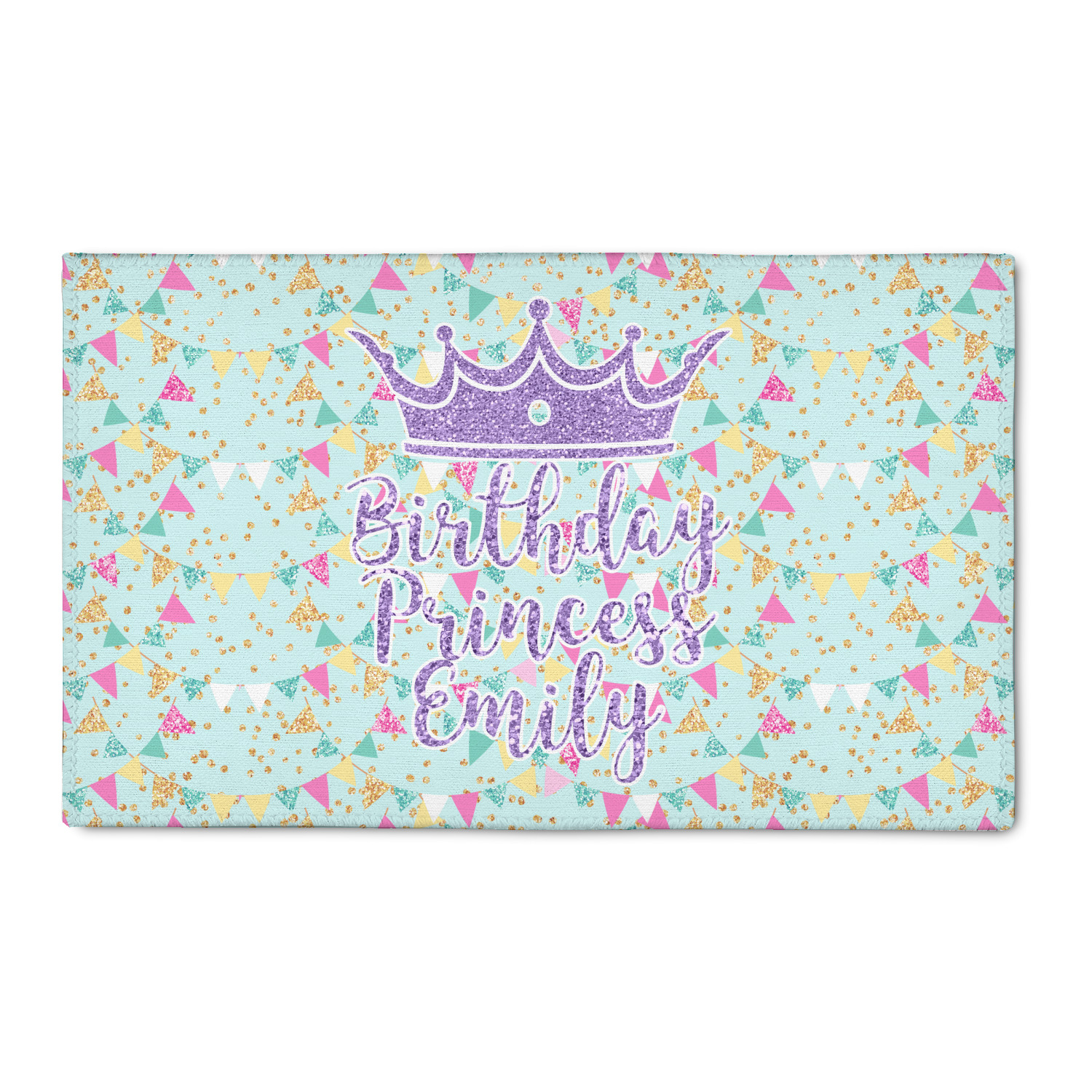 This design is bursting with fun! The background is a cool mint with brightly colored banners and confetti. The main graphic is a quote that says "Birthday Princess [Name Here]." This quote is filled with a fun glittery texture and can easily be changed to other fun patterns and colors.
