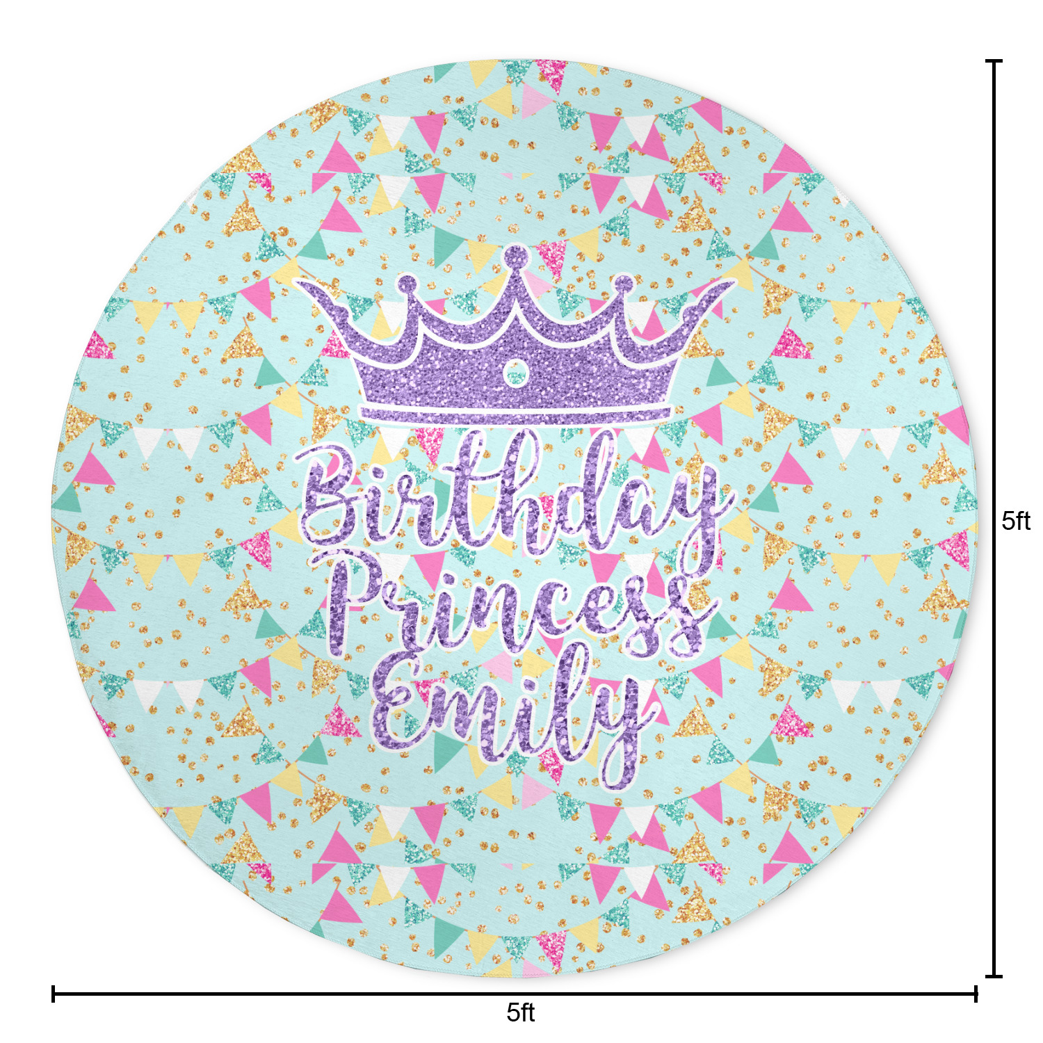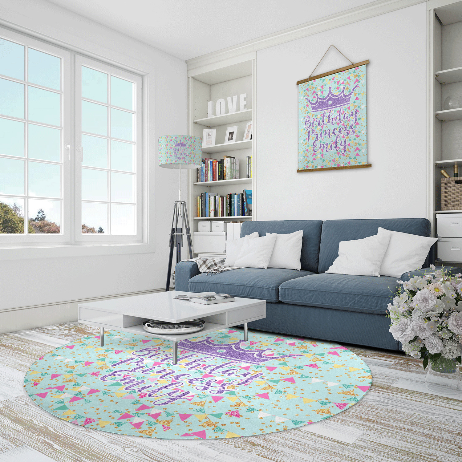 This design is bursting with fun! The background is a cool mint with brightly colored banners and confetti. The main graphic is a quote that says "Birthday Princess [Name Here]." This quote is filled with a fun glittery texture and can easily be changed to other fun patterns and colors.