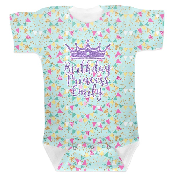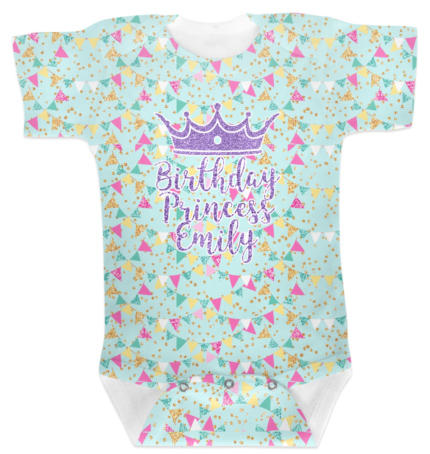 This design is bursting with fun! The background is a cool mint with brightly colored banners and confetti. The main graphic is a quote that says "Birthday Princess [Name Here]." This quote is filled with a fun glittery texture and can easily be changed to other fun patterns and colors.
