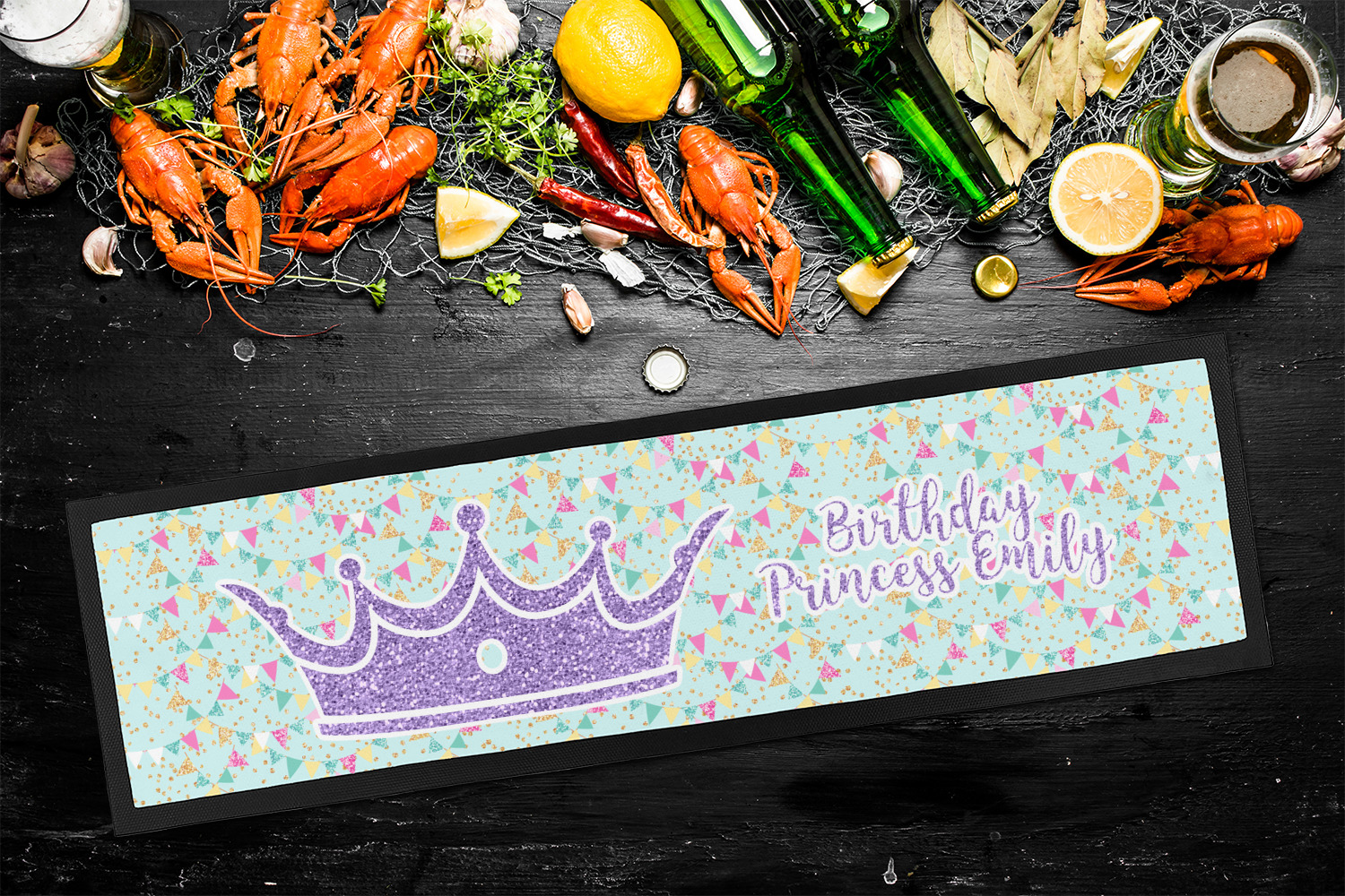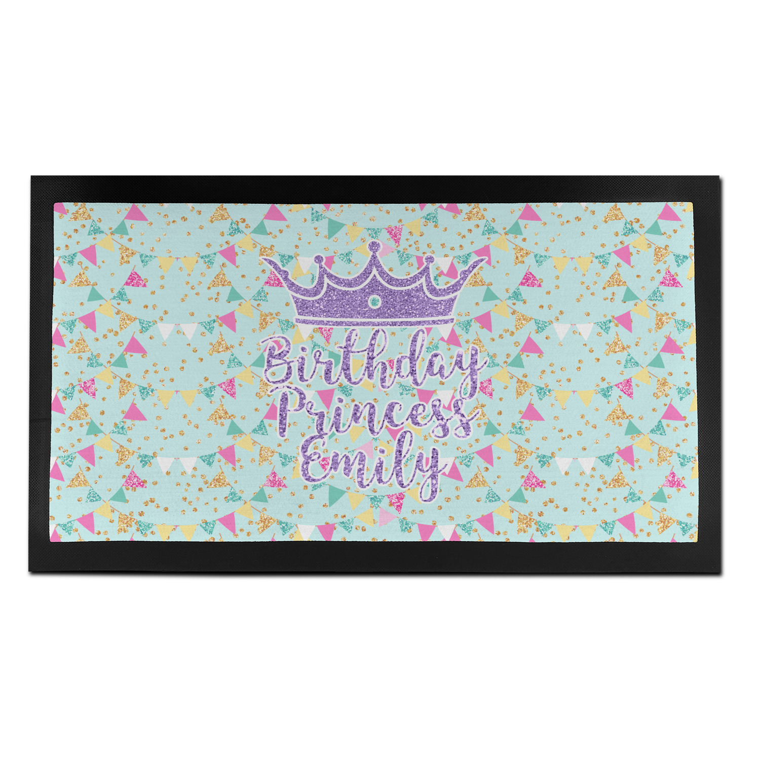 This design is bursting with fun! The background is a cool mint with brightly colored banners and confetti. The main graphic is a quote that says "Birthday Princess [Name Here]." This quote is filled with a fun glittery texture and can easily be changed to other fun patterns and colors.