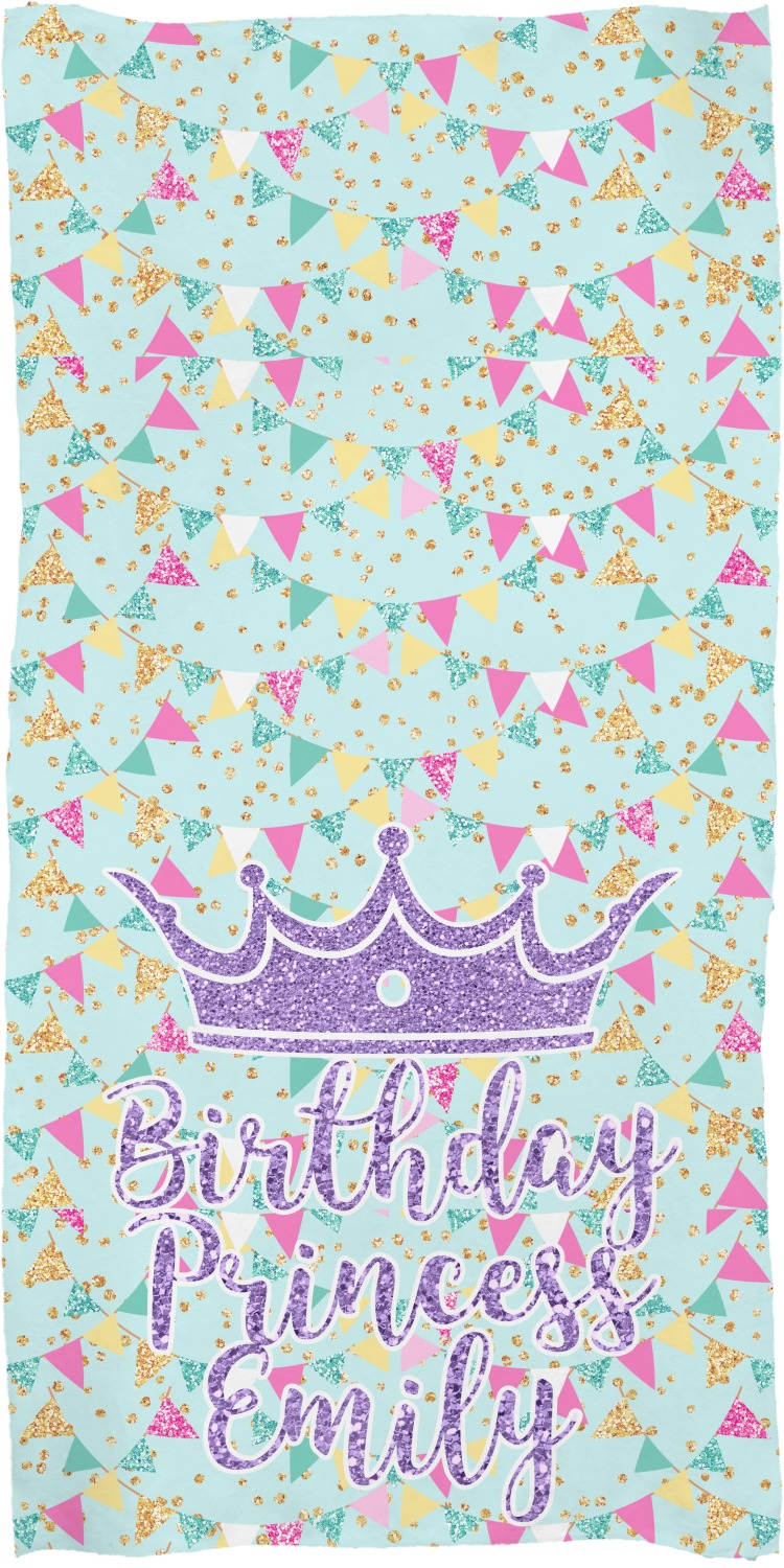 This design is bursting with fun! The background is a cool mint with brightly colored banners and confetti. The main graphic is a quote that says "Birthday Princess [Name Here]." This quote is filled with a fun glittery texture and can easily be changed to other fun patterns and colors.