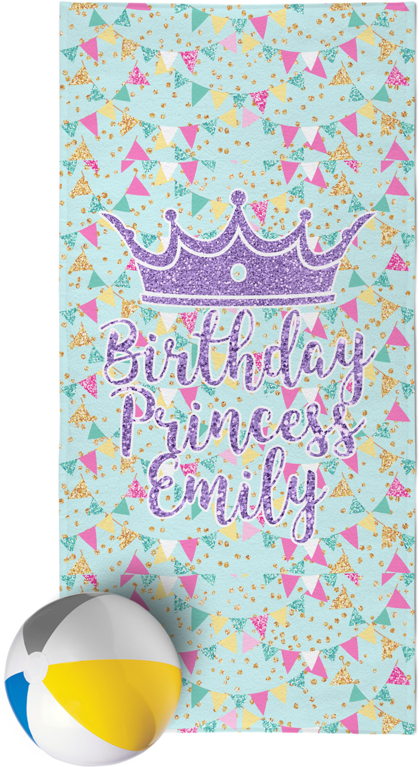 This design is bursting with fun! The background is a cool mint with brightly colored banners and confetti. The main graphic is a quote that says "Birthday Princess [Name Here]." This quote is filled with a fun glittery texture and can easily be changed to other fun patterns and colors.