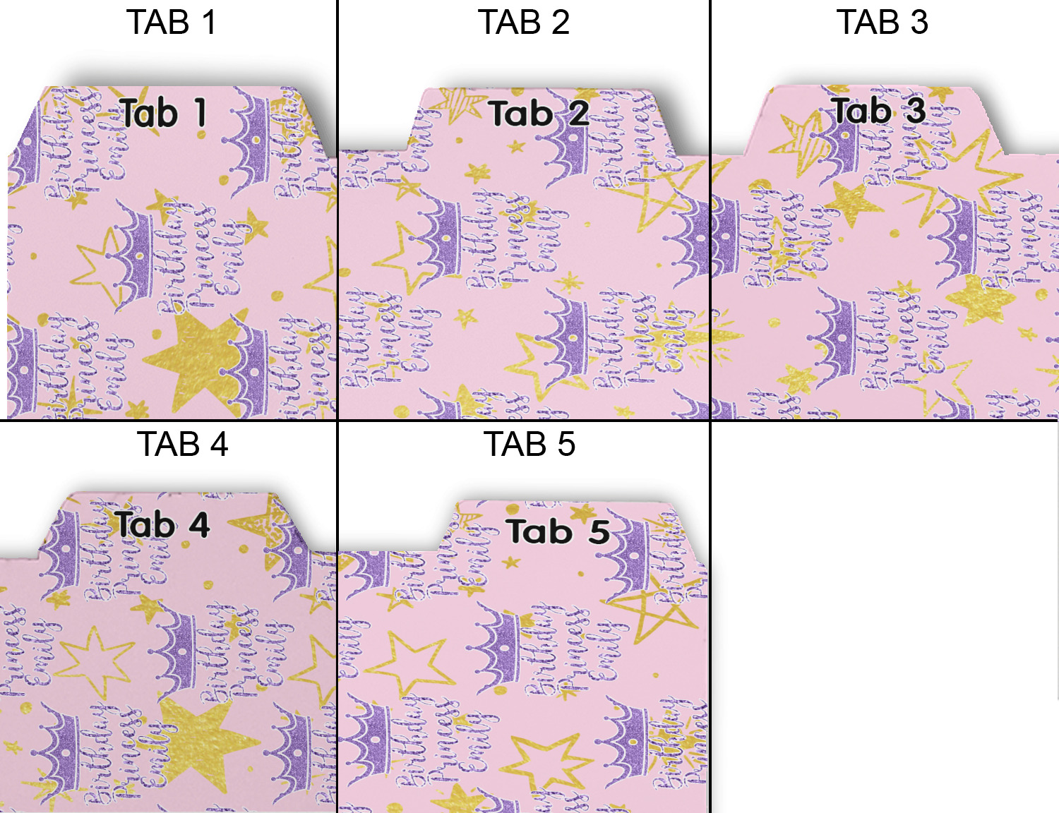 Made from a durable heavy weight card stock, these page dividers are printed on one side with your custom design. Customize the title on each tab as well as the background on each divider to make them unique to you. The possibilities are endless!