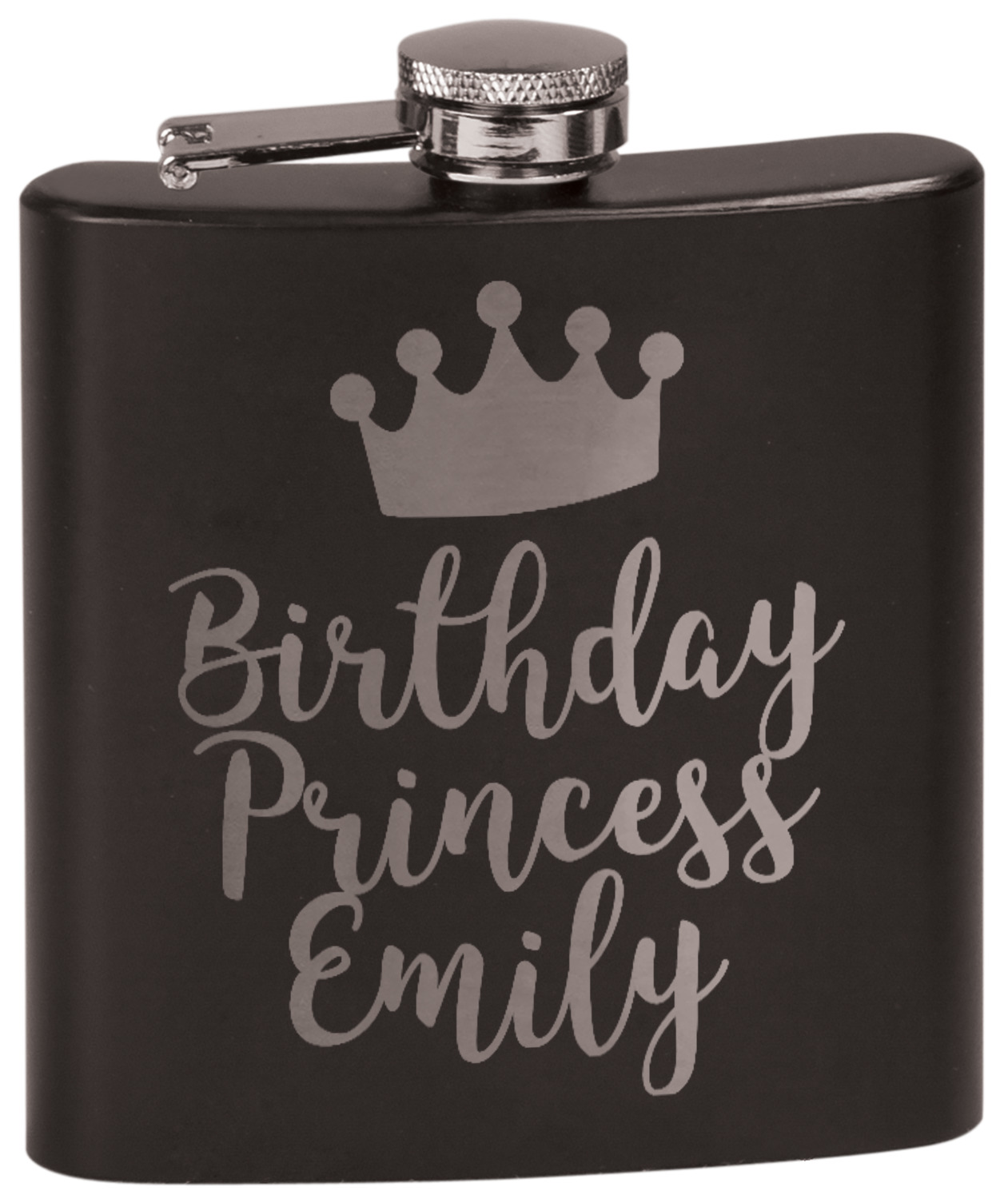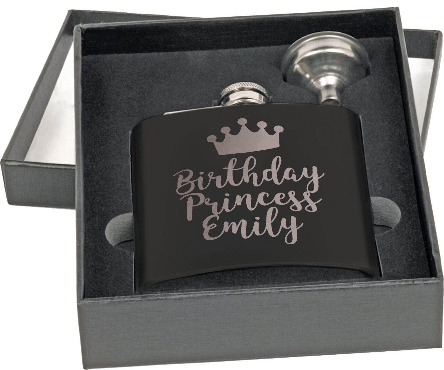 Built from a stainless steel and then covered with a black coating, this hip flask, has a very classy appearance. Similar to the standard flask, this stainless steel flask has the traditional curved shape for a snug fit in your palm. This flask set also includes a traditional screw and flip lid and liquid funnel in a gift box. At 4 by 4.5 inches, this flask can hold up to 6 ounces. Your personalized design is laser-engraved across the front of this flask.