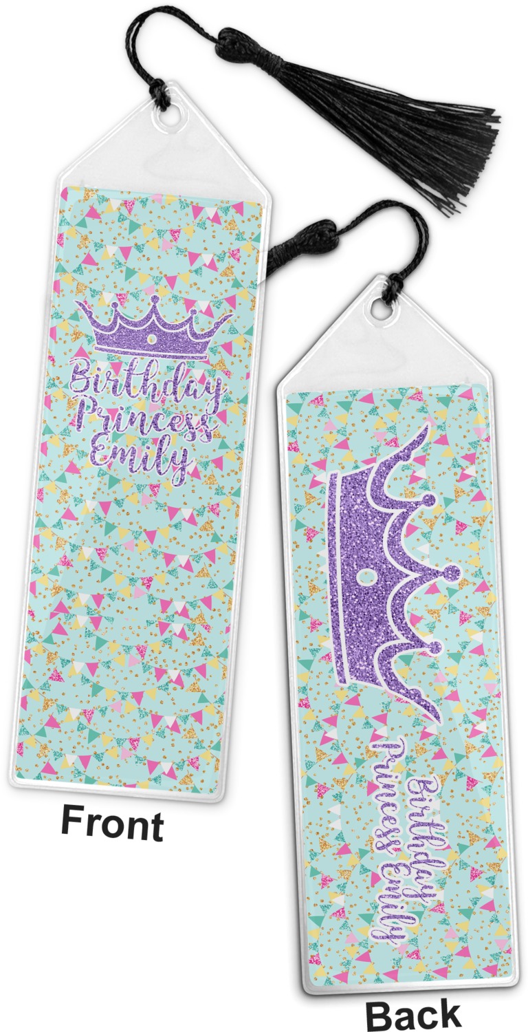 Your personalized bookmark is made of a sturdy, clear vinyl, and is approximately 7.5" x 2.25". We display your personalization on vinyl inserts that are placed on both sides. Accompanying each book marker is a black, fringe tassel that attaches to the reinforced, triangular header.