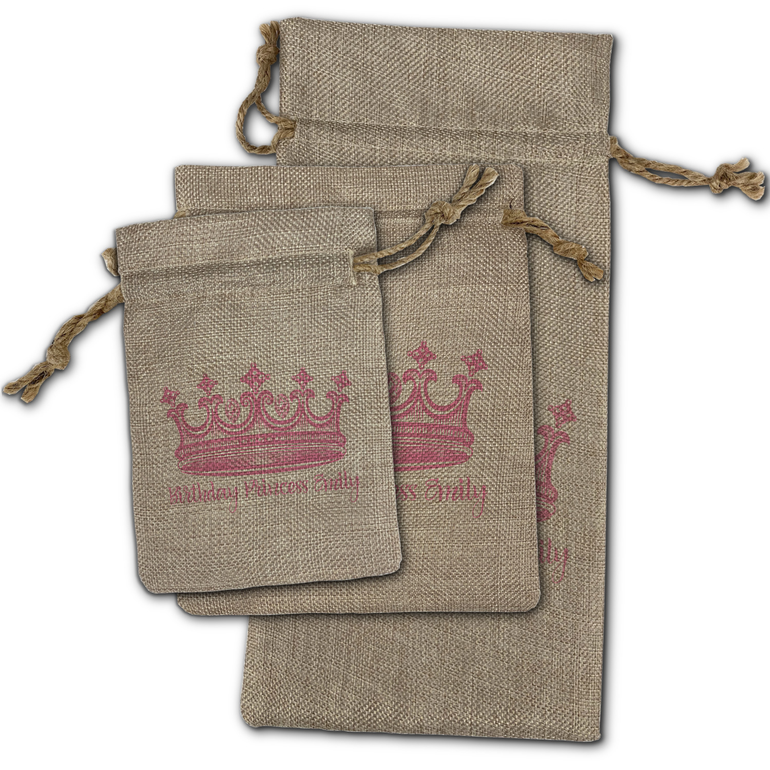We sell our Burlap Gift Bags in 3 variant sized bags. Made with burlap polyester, each personalized bag can be secured with a twine drawstring pull. Your custom design is available to print on one side or both sides - completely up to you! The sizes of the bags measure approximately 4.5" x 6.5" for the smallest size, 6.5" x 8.0" for the medium size, and 6.5" x 13.5" for the large-sized bag.