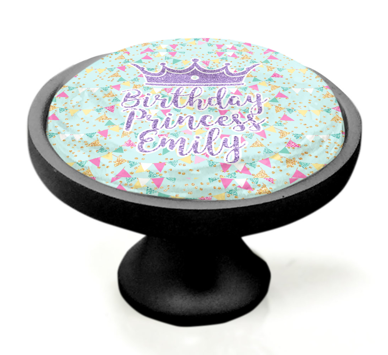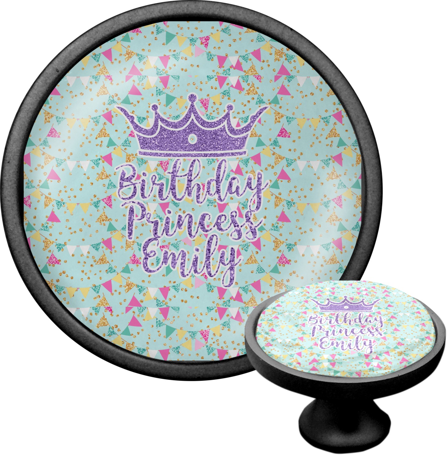 We sell these cabinet pulls in two different colors to better match your room's color scheme. We offer an oil-rubbed bronze base that is black in color, and a satin nickel option, which has a silver color. Your design is displayed across a high gloss vinyl insert that is placed on top of these cabinet handles. We then place a 1 inch thick glass cabochon atop the design, which seals the cabinet knob and makes the colors of your customization stand out. These custom cabinet knobs are approximately 1.3 inches in diameter. Your purchase includes a 1 inch screw that can be used to mount the knob to any cabinet in your home.