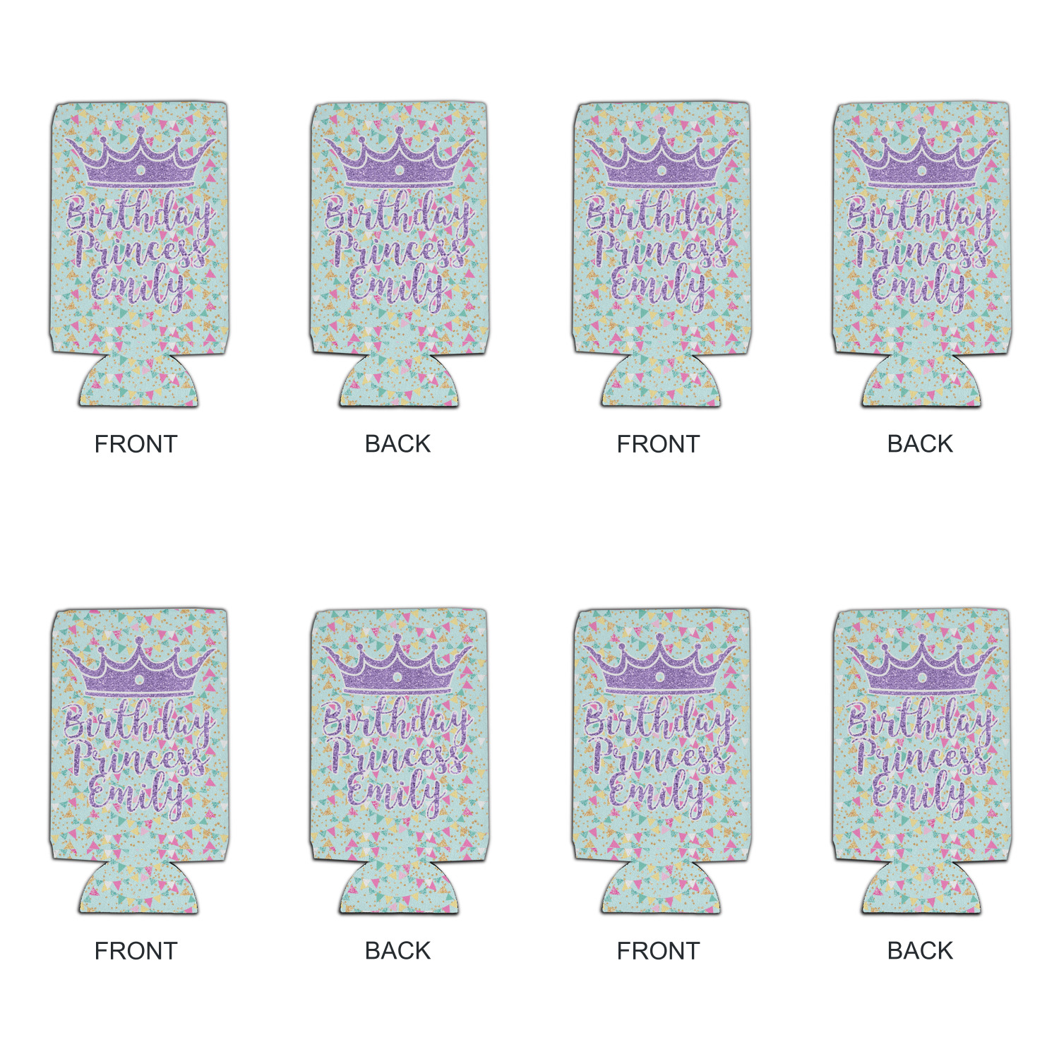 This design is bursting with fun! The background is a cool mint with brightly colored banners and confetti. The main graphic is a quote that says "Birthday Princess [Name Here]." This quote is filled with a fun glittery texture and can easily be changed to other fun patterns and colors.