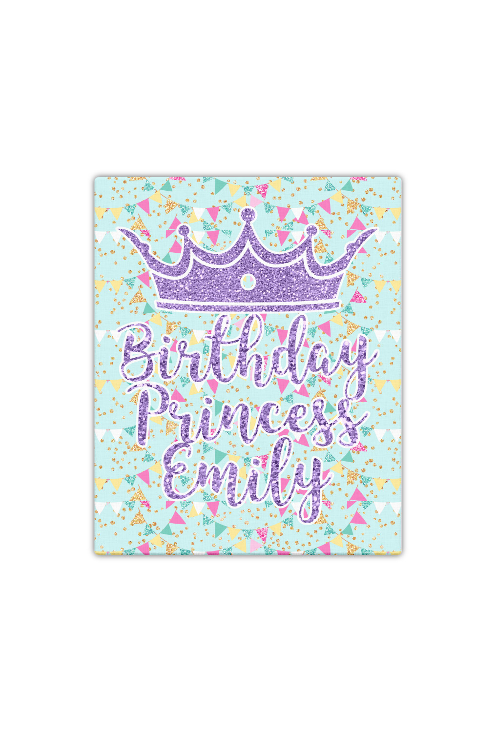 This design is bursting with fun! The background is a cool mint with brightly colored banners and confetti. The main graphic is a quote that says "Birthday Princess [Name Here]." This quote is filled with a fun glittery texture and can easily be changed to other fun patterns and colors.