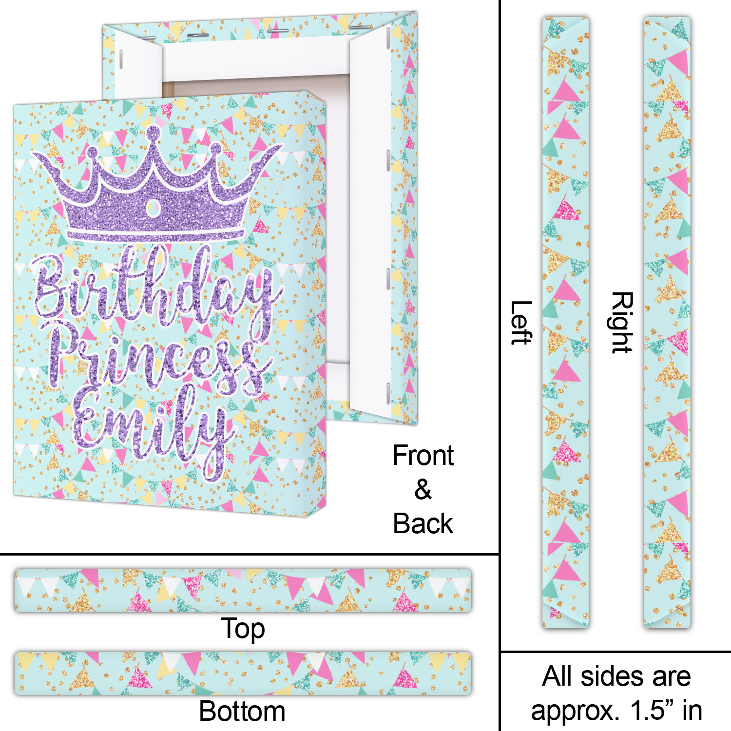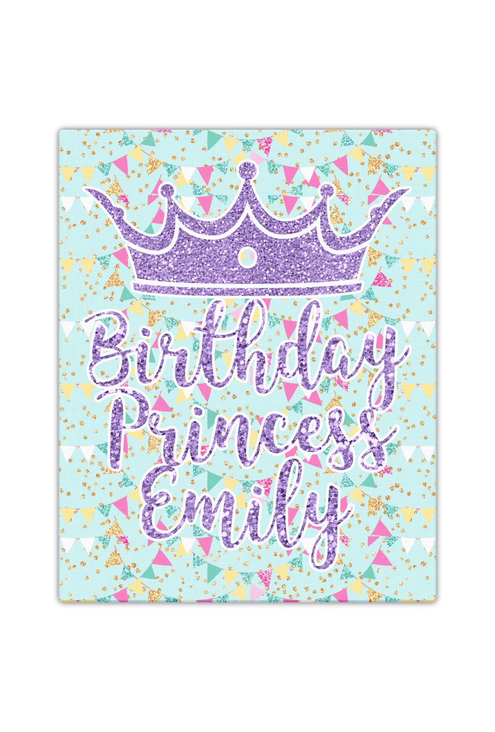This design is bursting with fun! The background is a cool mint with brightly colored banners and confetti. The main graphic is a quote that says "Birthday Princess [Name Here]." This quote is filled with a fun glittery texture and can easily be changed to other fun patterns and colors.