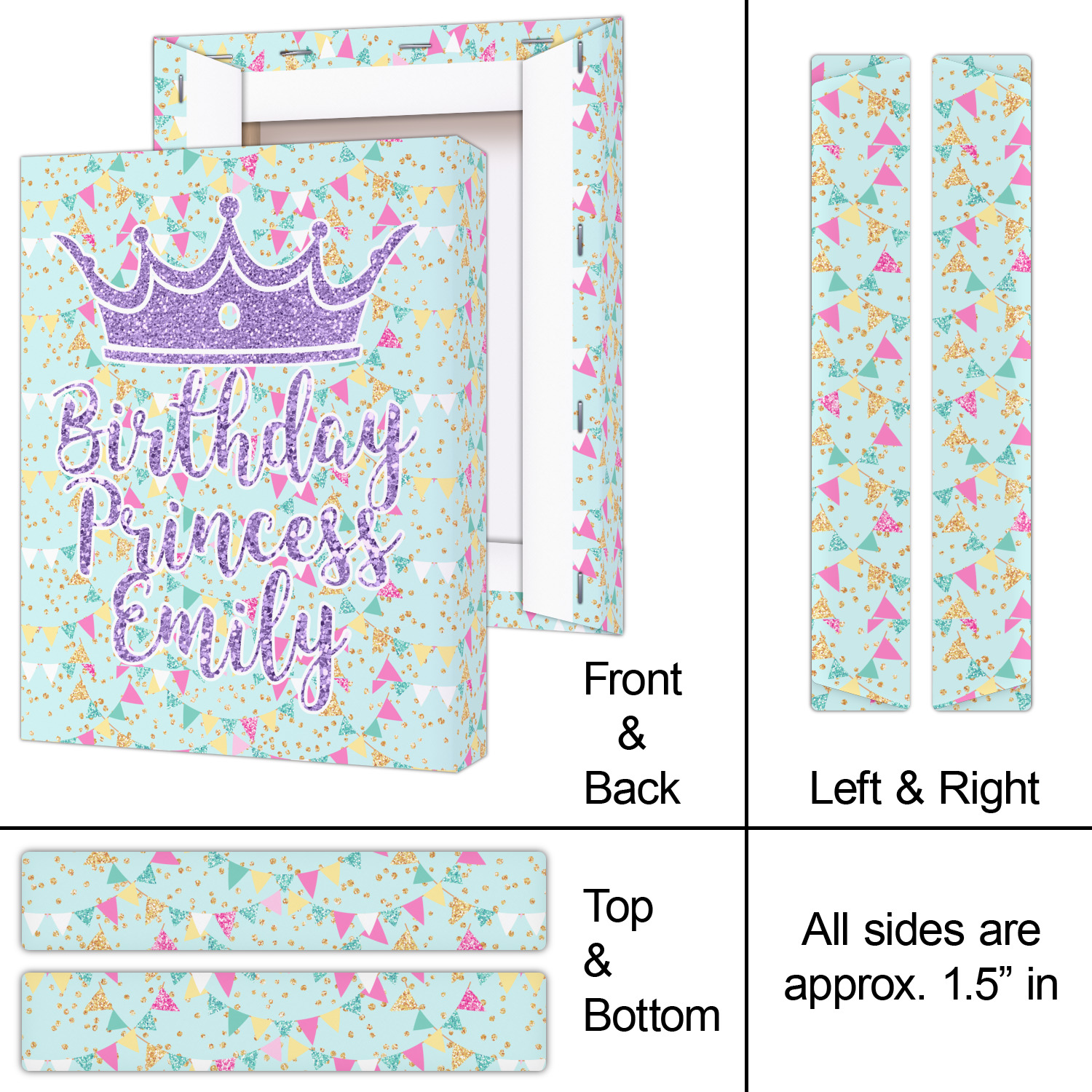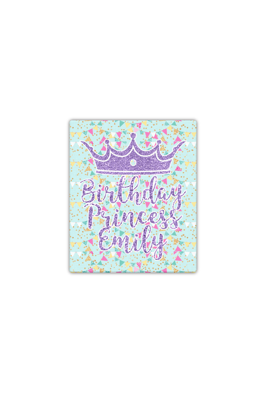 This design is bursting with fun! The background is a cool mint with brightly colored banners and confetti. The main graphic is a quote that says "Birthday Princess [Name Here]." This quote is filled with a fun glittery texture and can easily be changed to other fun patterns and colors.