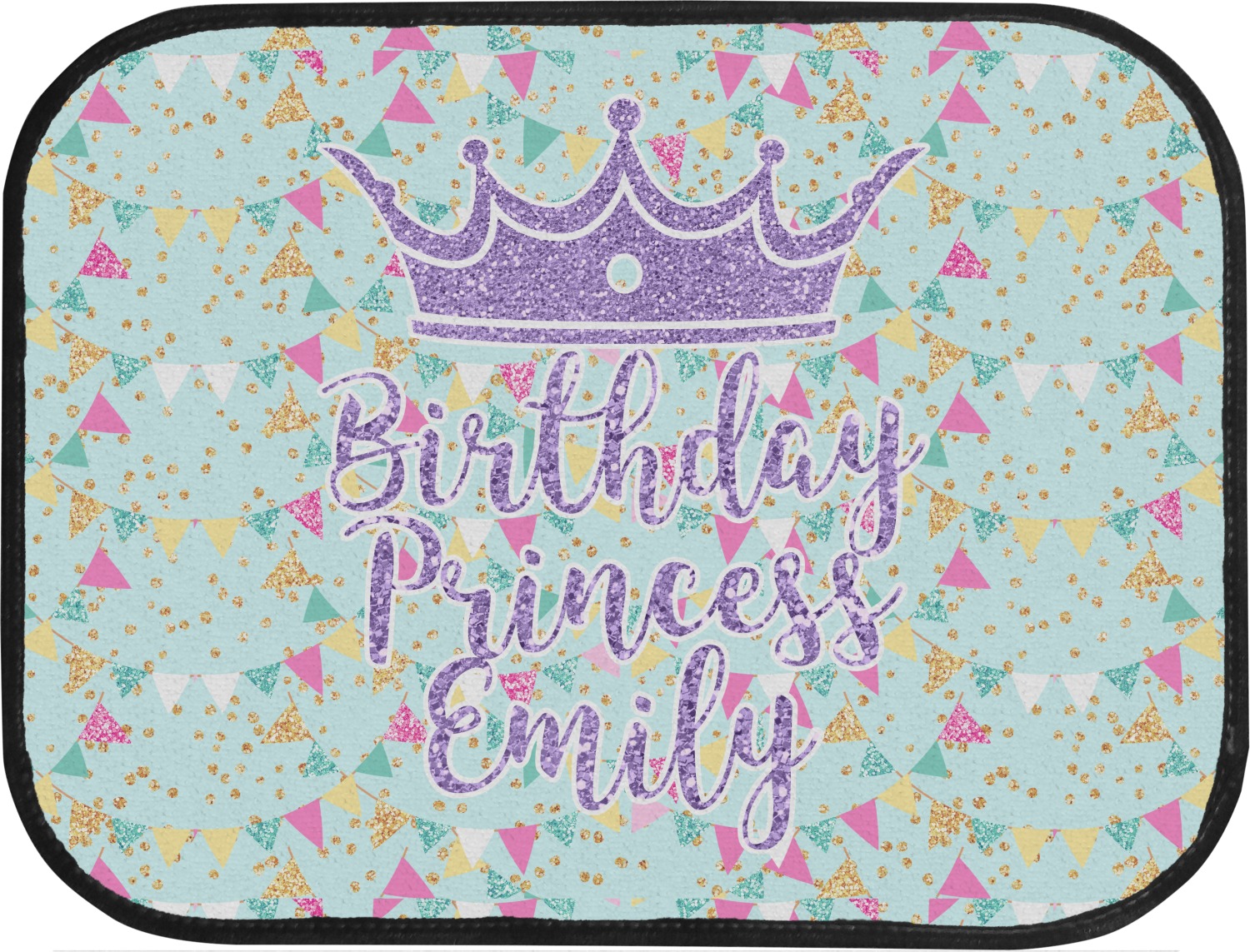 This design is bursting with fun! The background is a cool mint with brightly colored banners and confetti. The main graphic is a quote that says "Birthday Princess [Name Here]." This quote is filled with a fun glittery texture and can easily be changed to other fun patterns and colors.