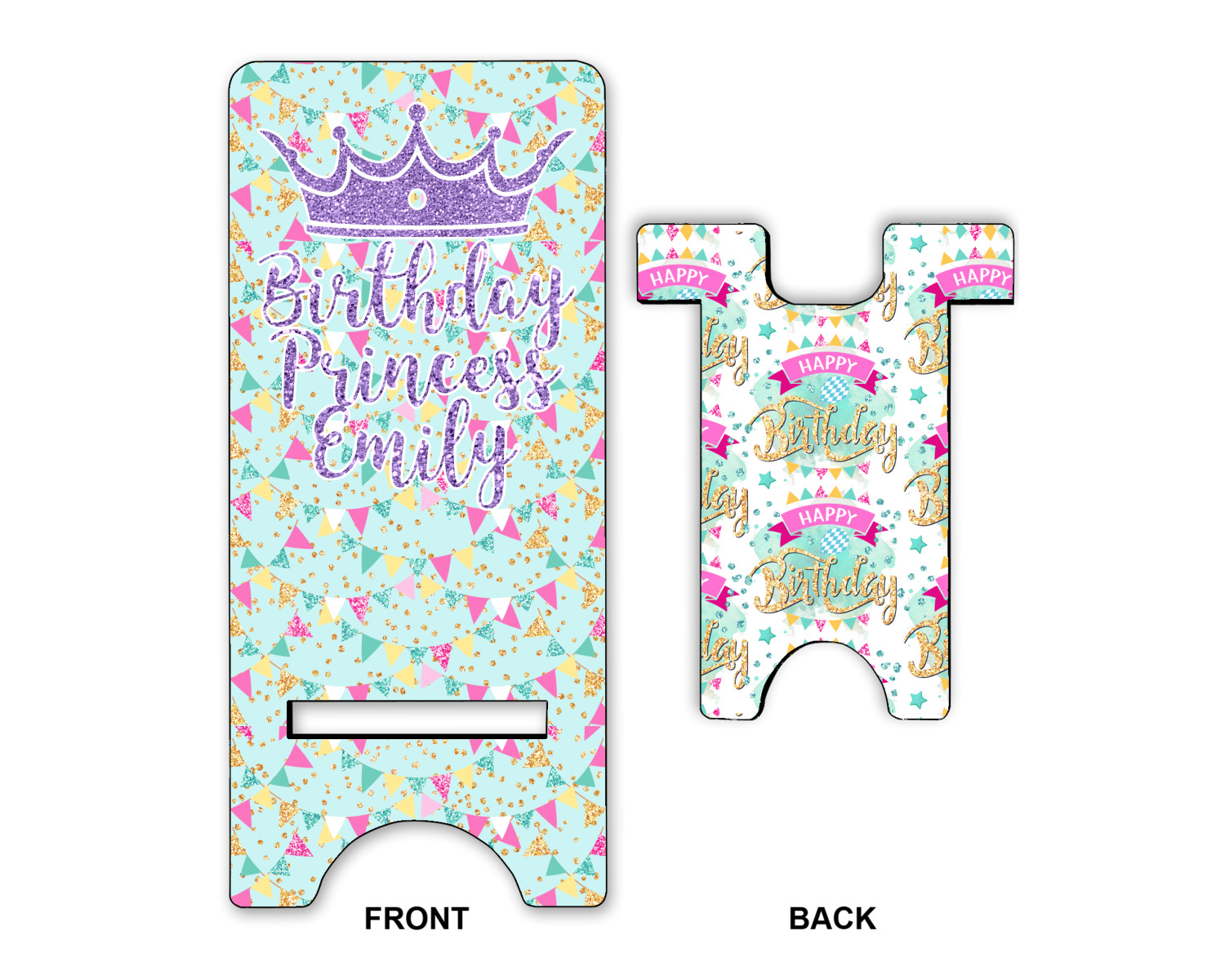 This design is bursting with fun! The background is a cool mint with brightly colored banners and confetti. The main graphic is a quote that says "Birthday Princess [Name Here]." This quote is filled with a fun glittery texture and can easily be changed to other fun patterns and colors.