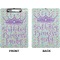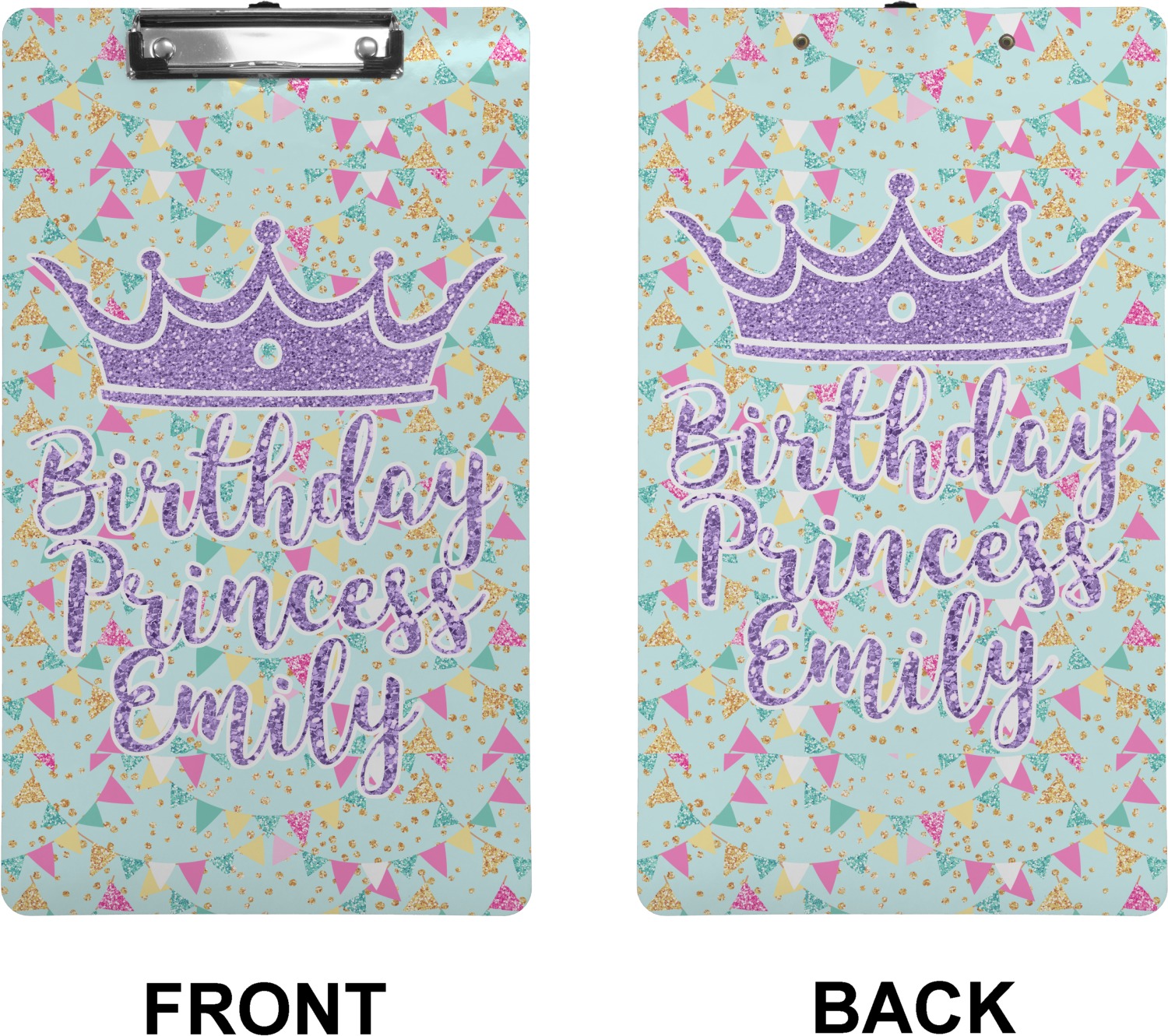 These custom clipboards are made from a strong hardboard and are coated with a glossy finish that accentuates the colors of your design. Alongside a retractable hook at its top, these decorative clipboards also feature sturdy clips to secure several sheets of paper. We sell these clipboards in two separate sizes. Our letter size measures at 12.5" L x 9" W, while our legal clipboard is approximately 15.5" L x 9" W. On both models, your personalization is printed on both sides of this clipboard and can be customized individually.