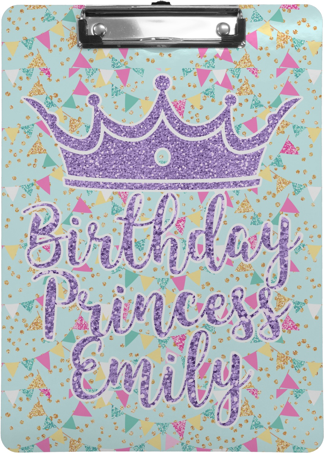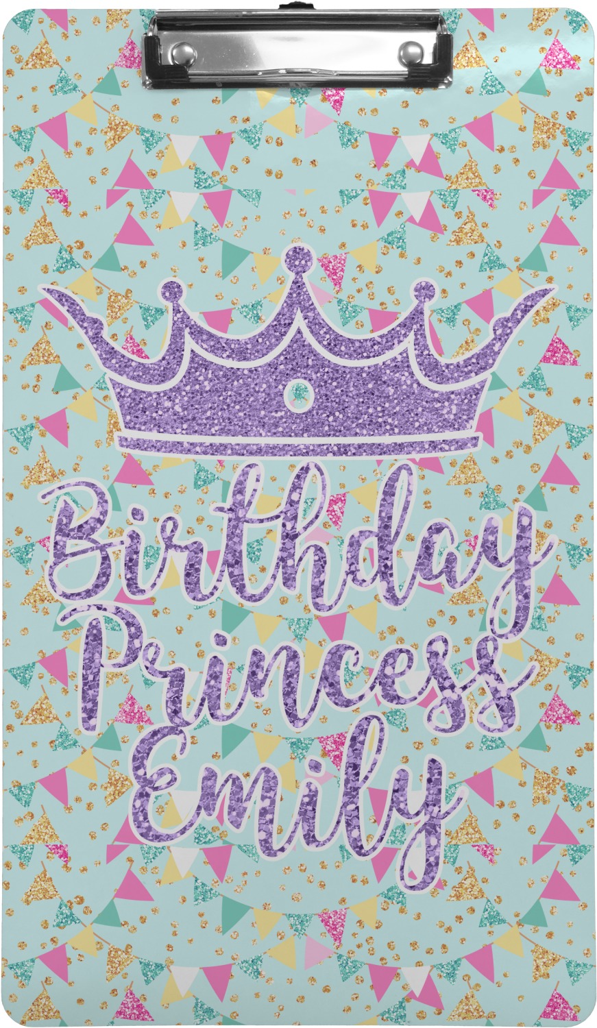 This design is bursting with fun! The background is a cool mint with brightly colored banners and confetti. The main graphic is a quote that says "Birthday Princess [Name Here]." This quote is filled with a fun glittery texture and can easily be changed to other fun patterns and colors.