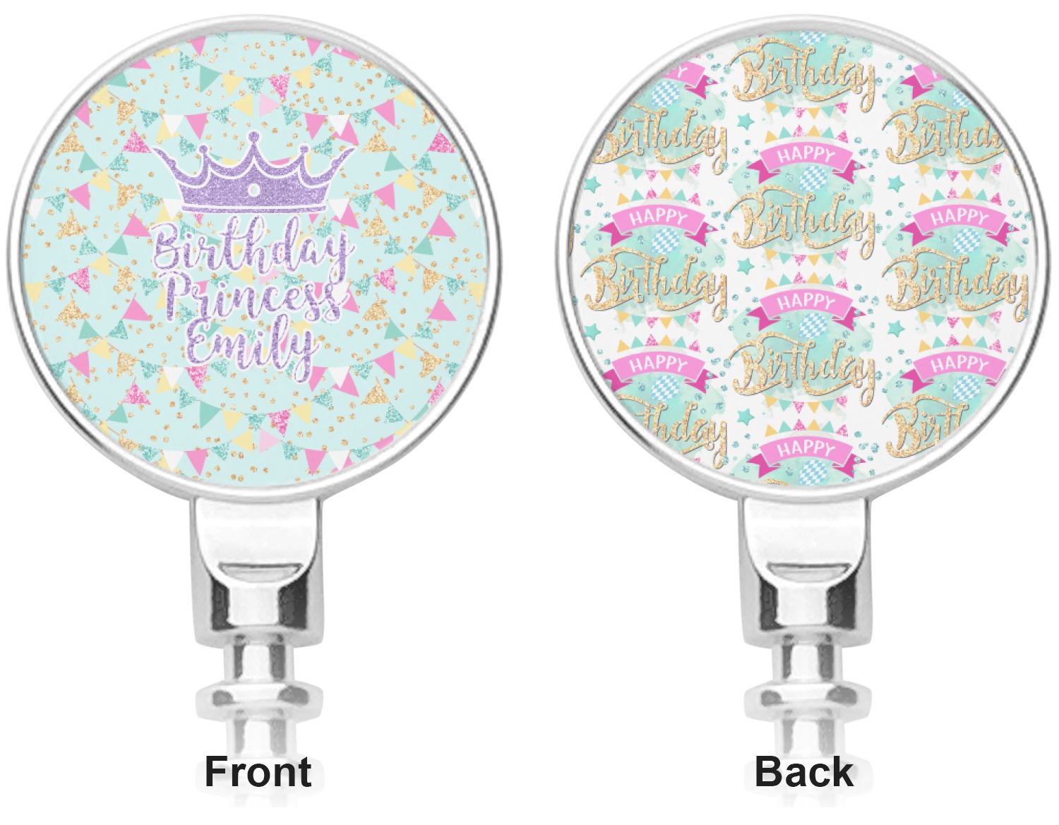 This design is bursting with fun! The background is a cool mint with brightly colored banners and confetti. The main graphic is a quote that says "Birthday Princess [Name Here]." This quote is filled with a fun glittery texture and can easily be changed to other fun patterns and colors.