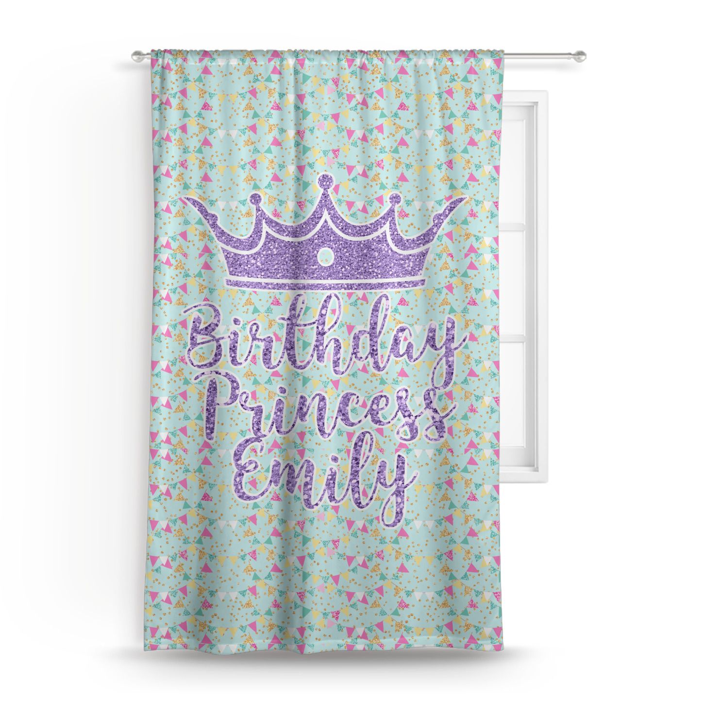 This design is bursting with fun! The background is a cool mint with brightly colored banners and confetti. The main graphic is a quote that says "Birthday Princess [Name Here]." This quote is filled with a fun glittery texture and can easily be changed to other fun patterns and colors.