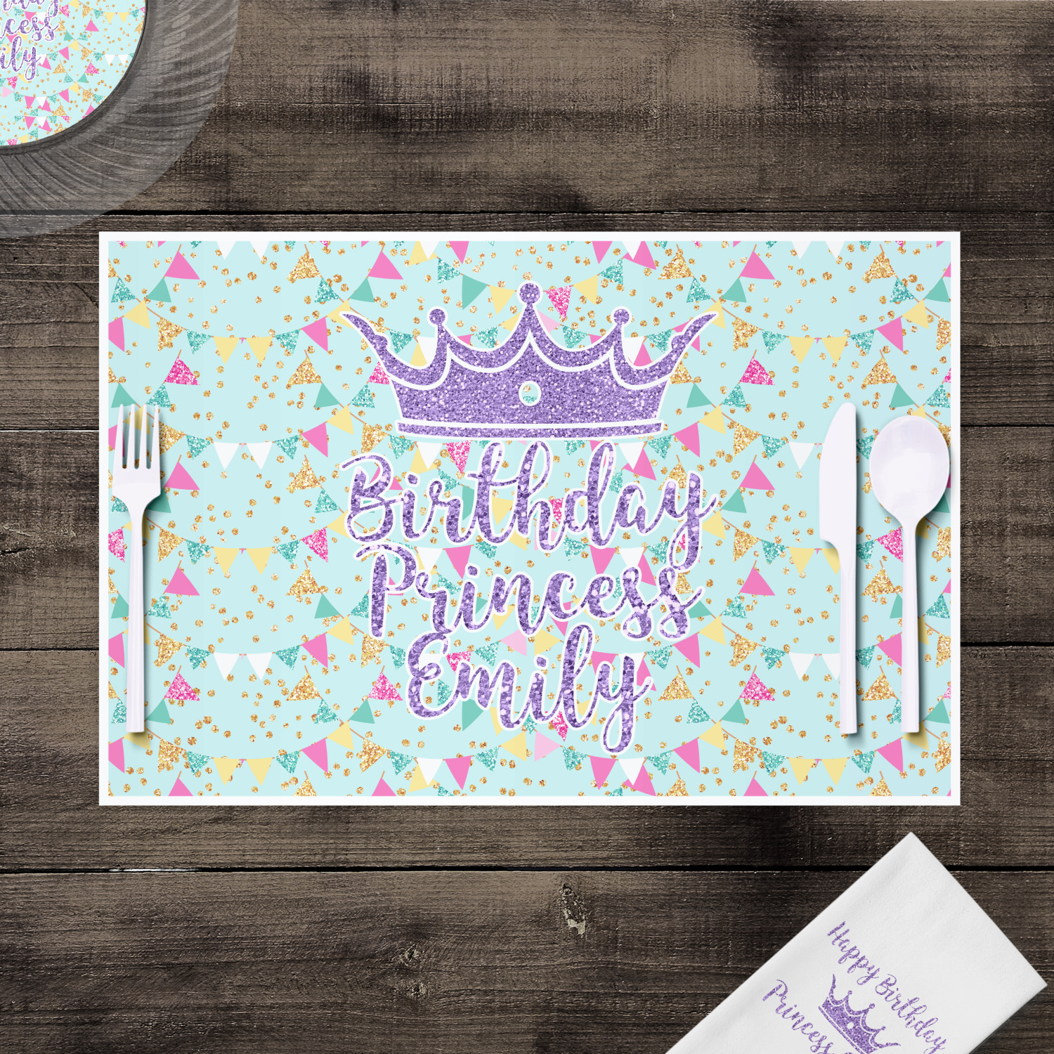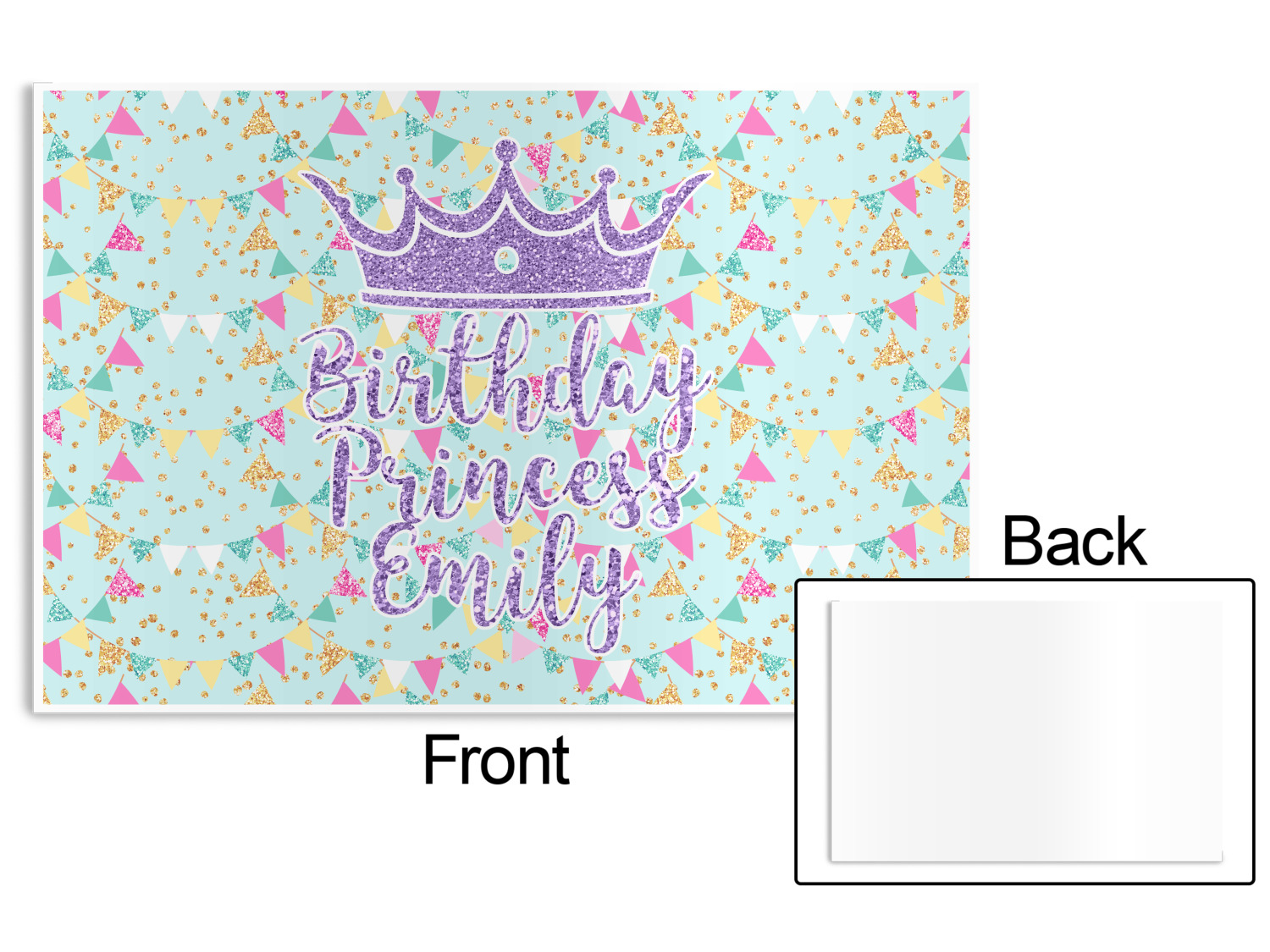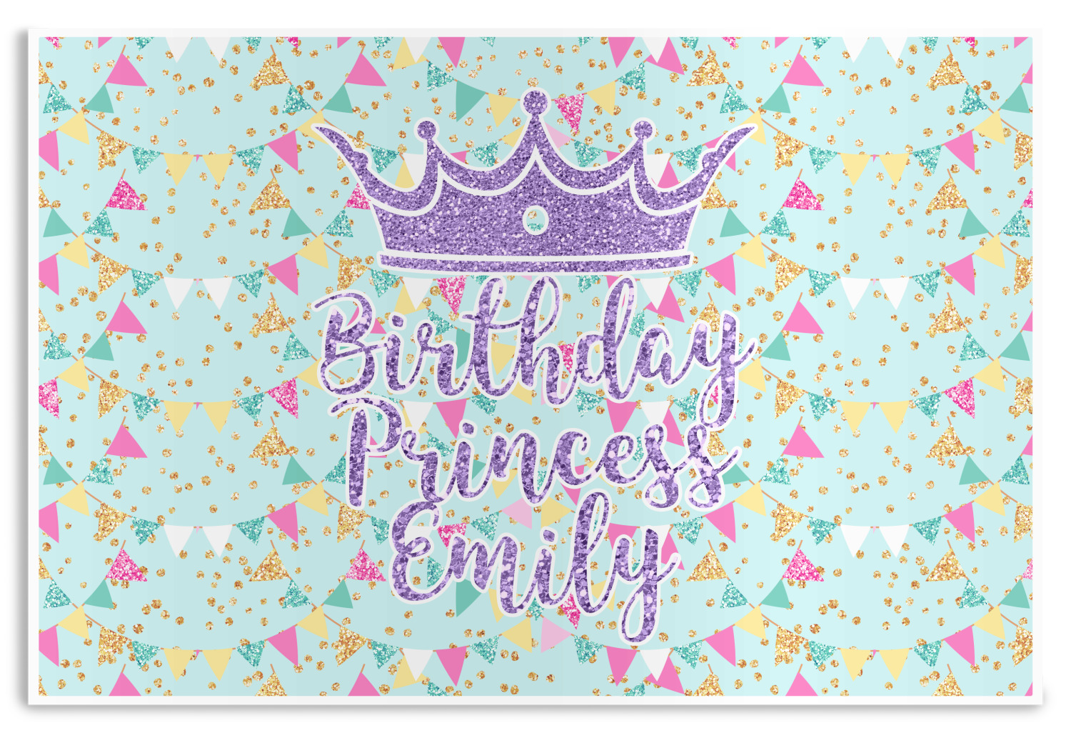This design is bursting with fun! The background is a cool mint with brightly colored banners and confetti. The main graphic is a quote that says "Birthday Princess [Name Here]." This quote is filled with a fun glittery texture and can easily be changed to other fun patterns and colors.