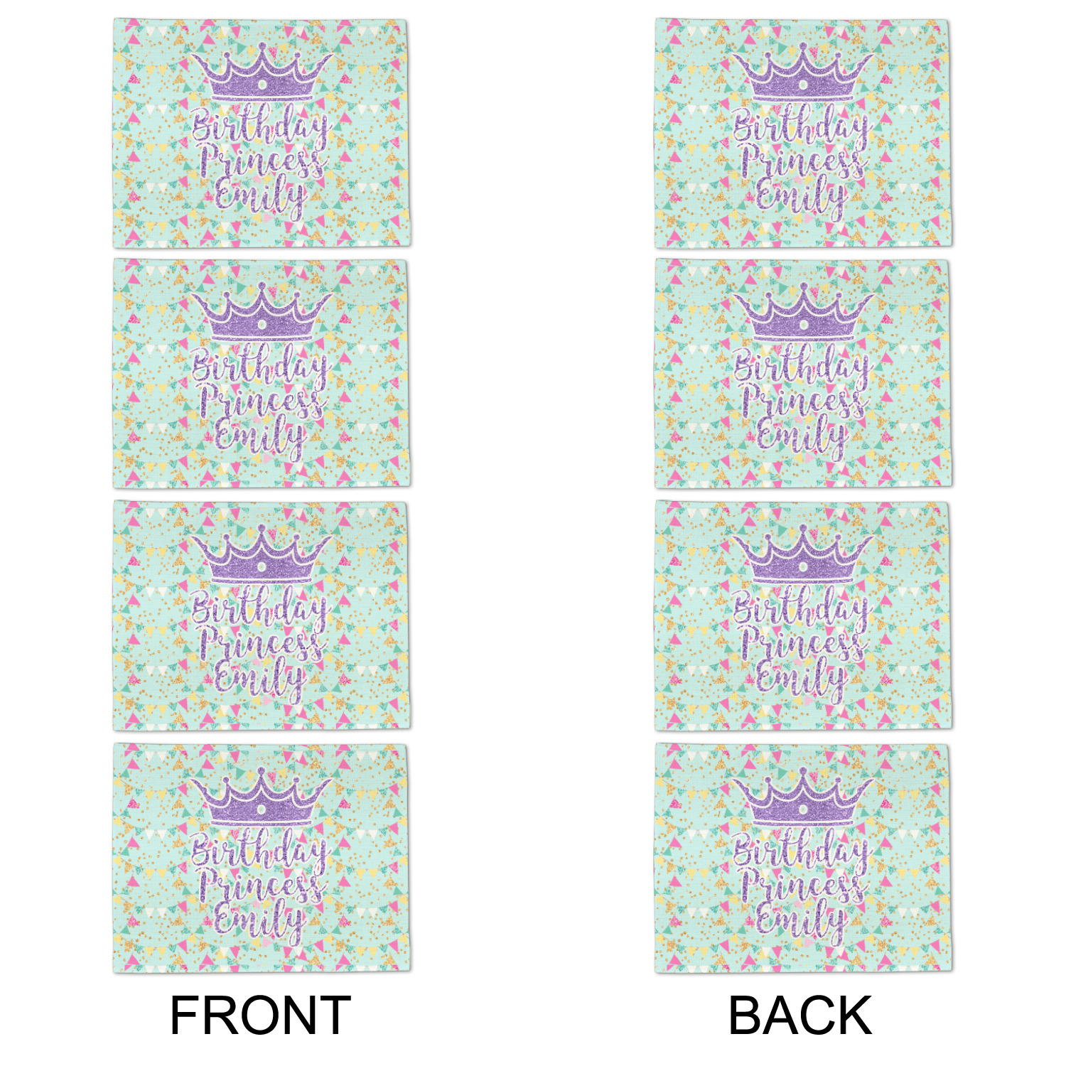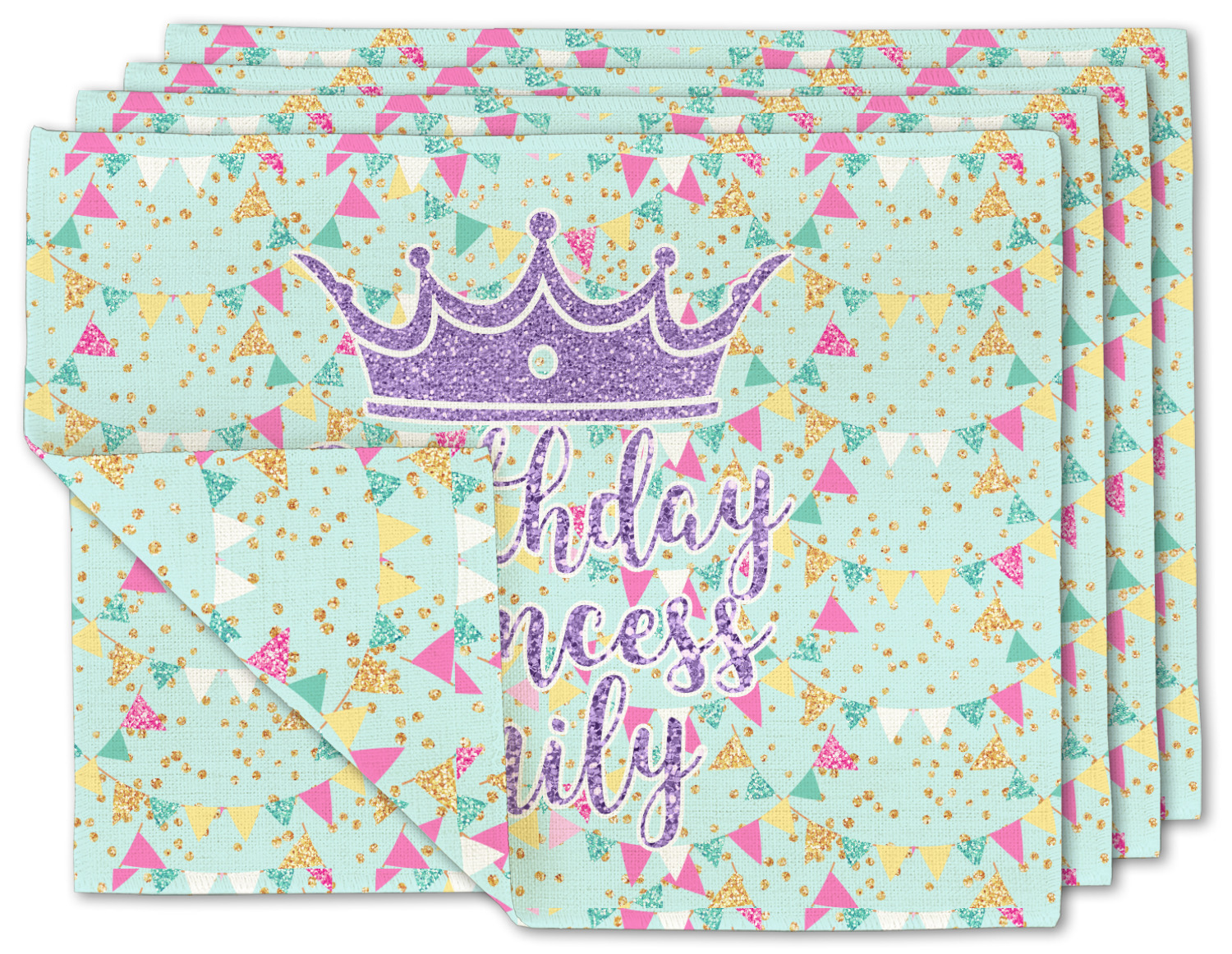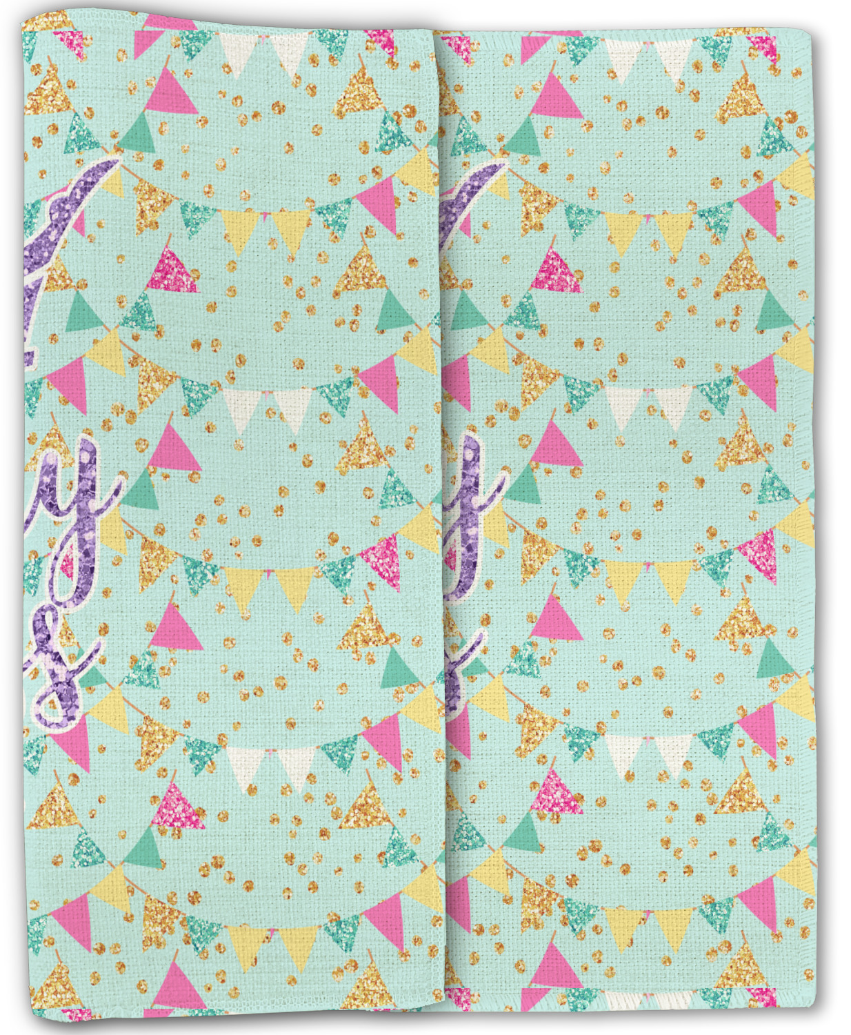 This design is bursting with fun! The background is a cool mint with brightly colored banners and confetti. The main graphic is a quote that says "Birthday Princess [Name Here]." This quote is filled with a fun glittery texture and can easily be changed to other fun patterns and colors.
