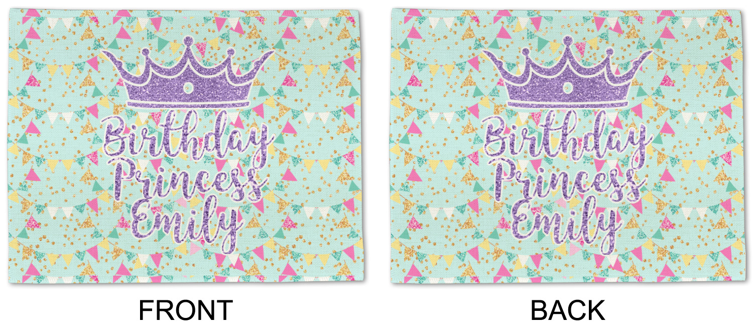 This design is bursting with fun! The background is a cool mint with brightly colored banners and confetti. The main graphic is a quote that says "Birthday Princess [Name Here]." This quote is filled with a fun glittery texture and can easily be changed to other fun patterns and colors.