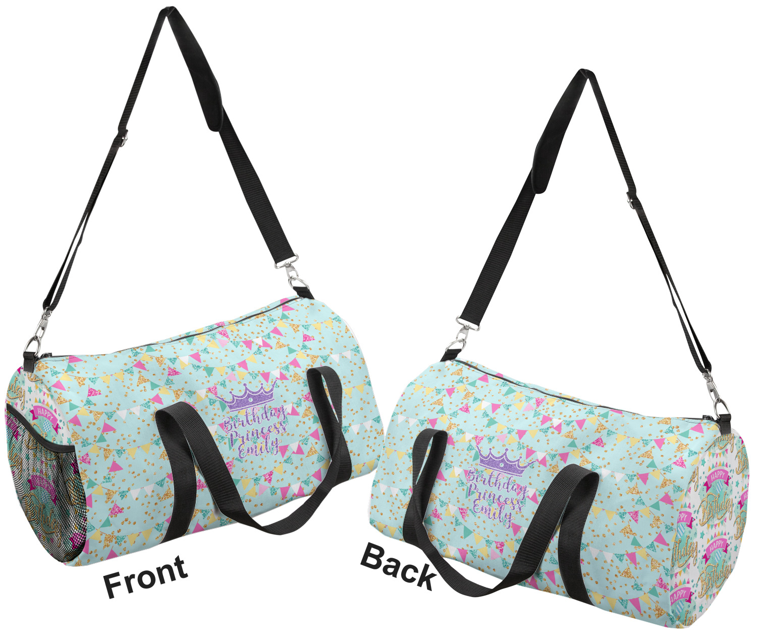 This duffle is a sturdy bag made of a canvas material. It comes in two sizes: Small (19"W x 9.5"H x 9.5"D) and Large (23"W x 12"H x 12"D). The bag is a cylindrical shape with a black adjustable strap and two handles. On one side is an elastic pouch to put a waterbottle or other small item. Your product will be sublimated with your design and is able to be designed on the front, back, and sides. Be sure to remember that the straps may cut into parts of your design if you upload your own artwork.