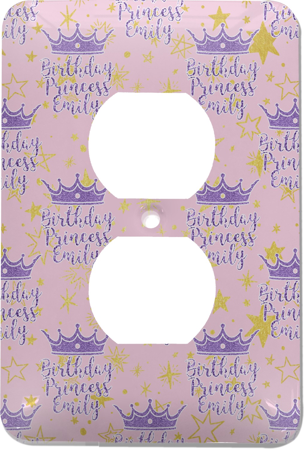 These outlet covers are made from a sturdy metal and display your design across its face. A satin finish coats the design to give it a finished look. The center of this outlet plate cover has a small hole to accommodate a screw upon installation. With your purchase of this decorative outlet cover, we include one screw. This outlet plate is of a standard size, and measures at approximately 3.5 by 5 inches.