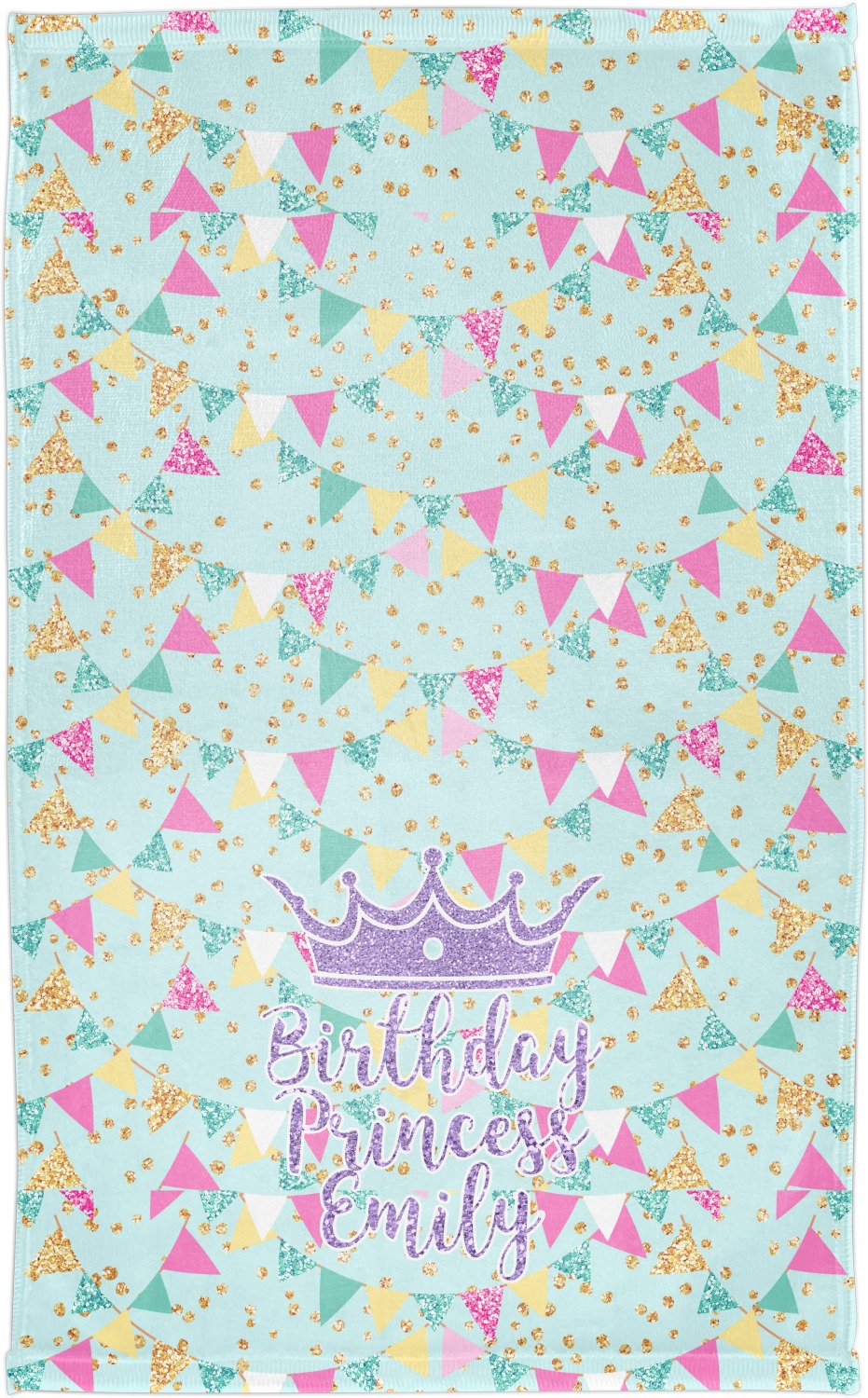 This design is bursting with fun! The background is a cool mint with brightly colored banners and confetti. The main graphic is a quote that says "Birthday Princess [Name Here]." This quote is filled with a fun glittery texture and can easily be changed to other fun patterns and colors.