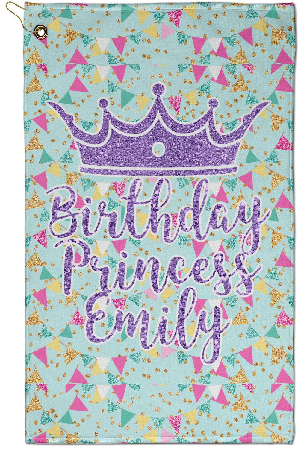 This design is bursting with fun! The background is a cool mint with brightly colored banners and confetti. The main graphic is a quote that says "Birthday Princess [Name Here]." This quote is filled with a fun glittery texture and can easily be changed to other fun patterns and colors.