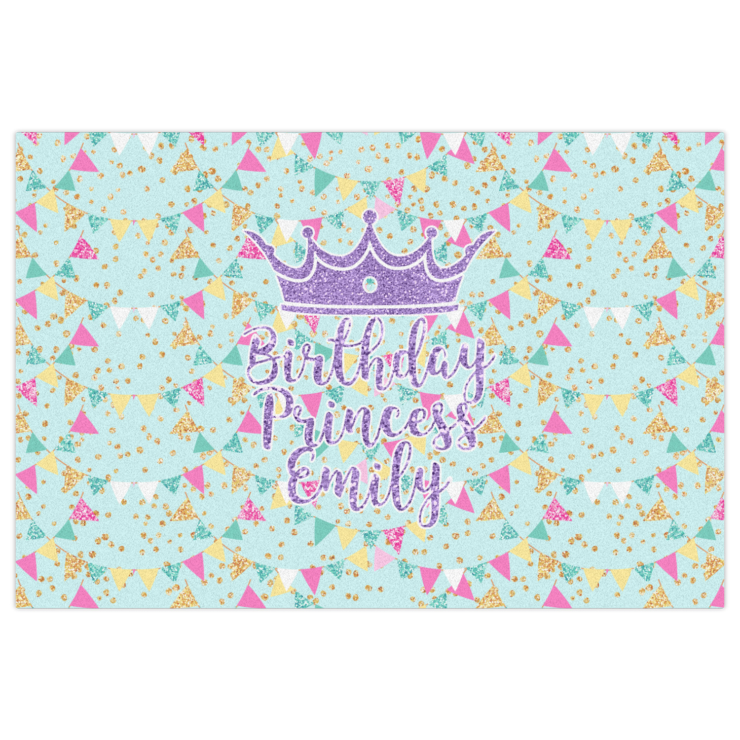This design is bursting with fun! The background is a cool mint with brightly colored banners and confetti. The main graphic is a quote that says "Birthday Princess [Name Here]." This quote is filled with a fun glittery texture and can easily be changed to other fun patterns and colors.