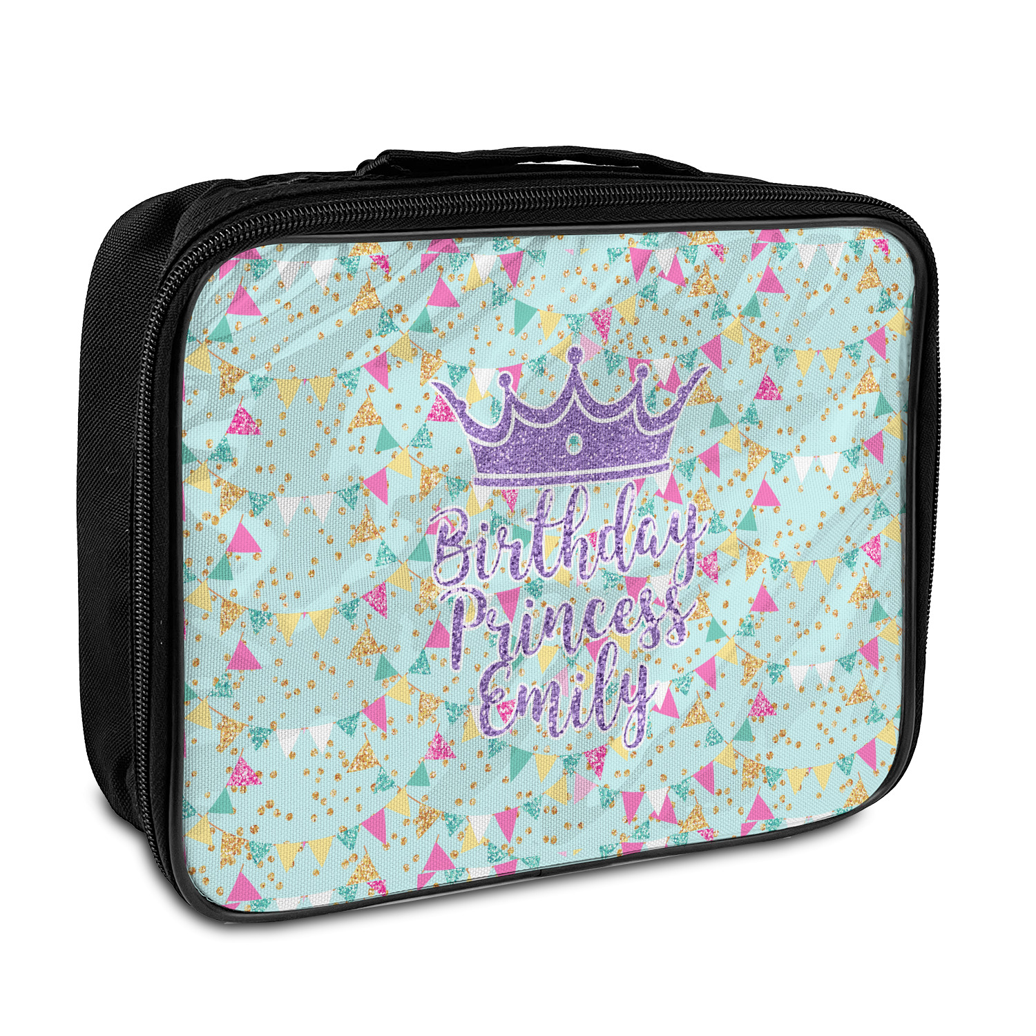 This design is bursting with fun! The background is a cool mint with brightly colored banners and confetti. The main graphic is a quote that says "Birthday Princess [Name Here]." This quote is filled with a fun glittery texture and can easily be changed to other fun patterns and colors.