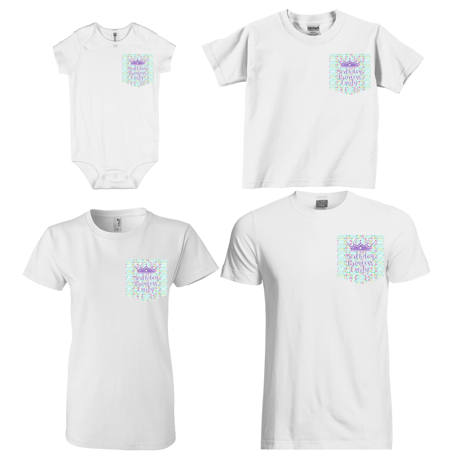 The faux pockets are available in 4 different sizes - for baby, kids, youth/women & men; the whole family can have the same pocket design, but sized just for them! The pockets are printed using our direct-to-film technology to the exact shape & size. We have faux stitching around the pocket, with double stitching on the top of the pocket to give it the authentic pocket look!