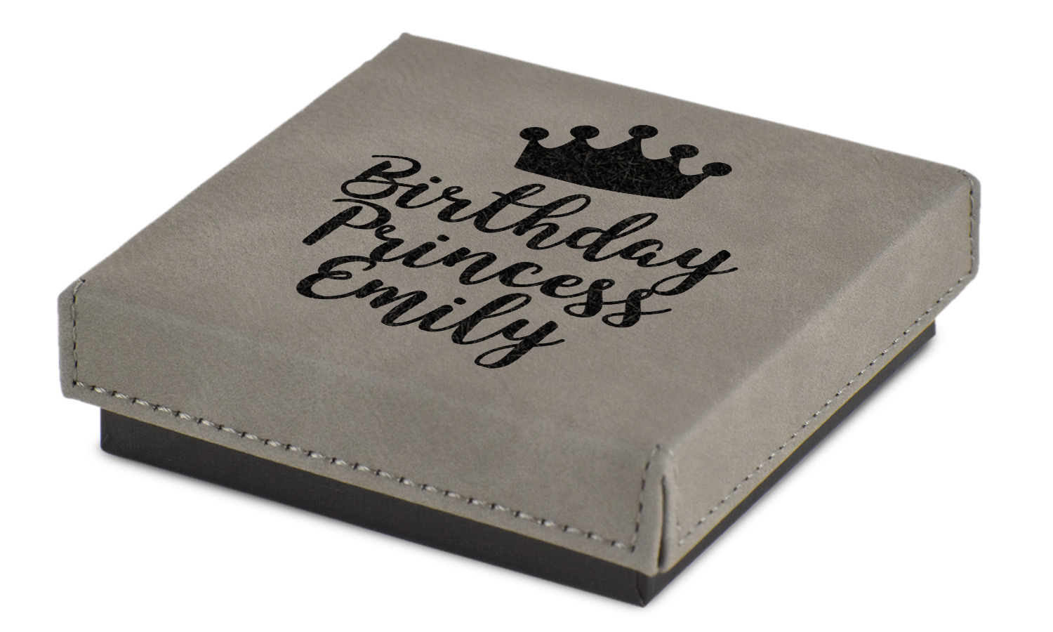 This jewelry gift box measures 3.5 inches long by 3.5 inches wide, and 1 inch deep. The box fits different sized jewelry items such as bracelets, necklaces, watches, earrings, rings and more. Engraved with a laser this high quality paper board and faux leather jewelry gift box is unique and makes any gift stand out.