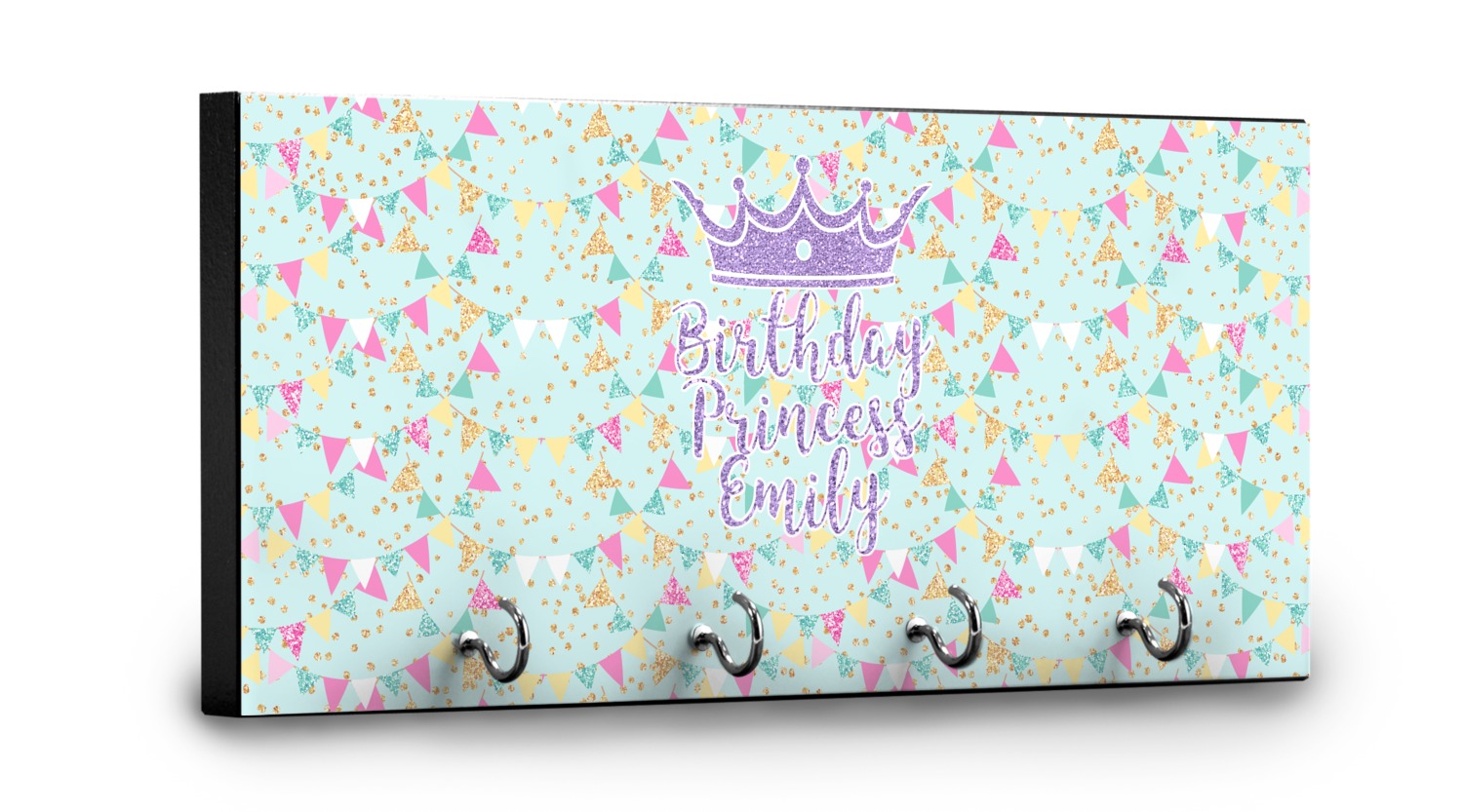 This design is bursting with fun! The background is a cool mint with brightly colored banners and confetti. The main graphic is a quote that says "Birthday Princess [Name Here]." This quote is filled with a fun glittery texture and can easily be changed to other fun patterns and colors.