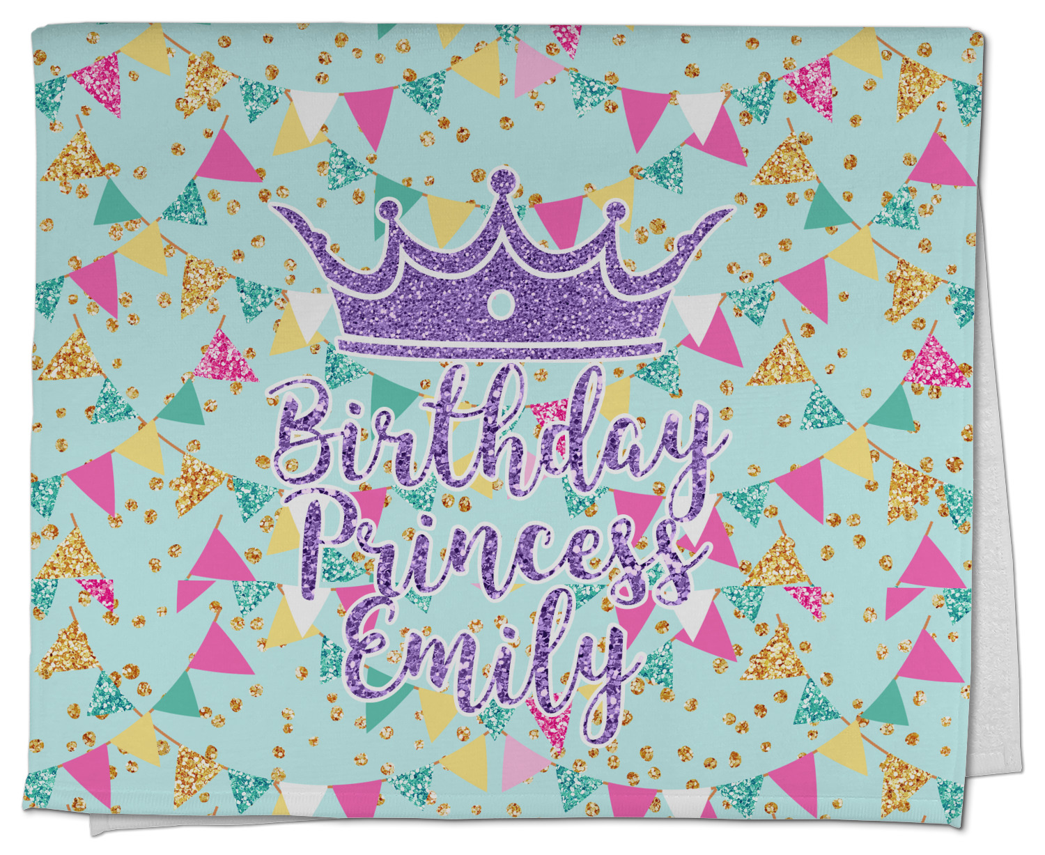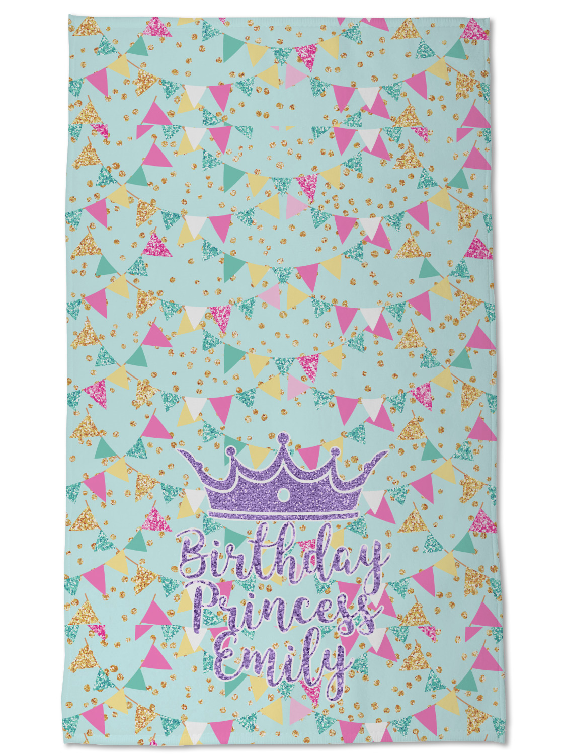 This design is bursting with fun! The background is a cool mint with brightly colored banners and confetti. The main graphic is a quote that says "Birthday Princess [Name Here]." This quote is filled with a fun glittery texture and can easily be changed to other fun patterns and colors.