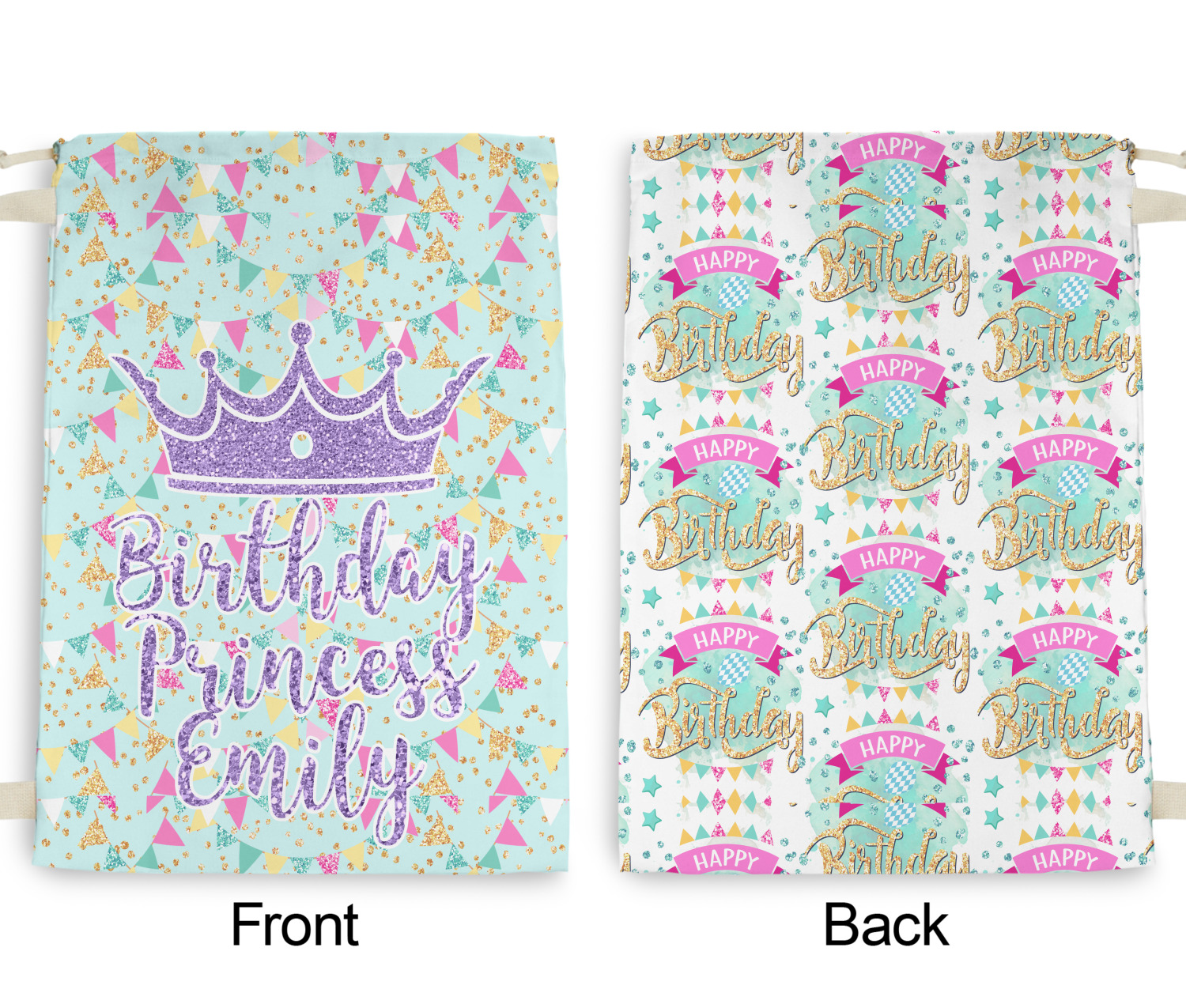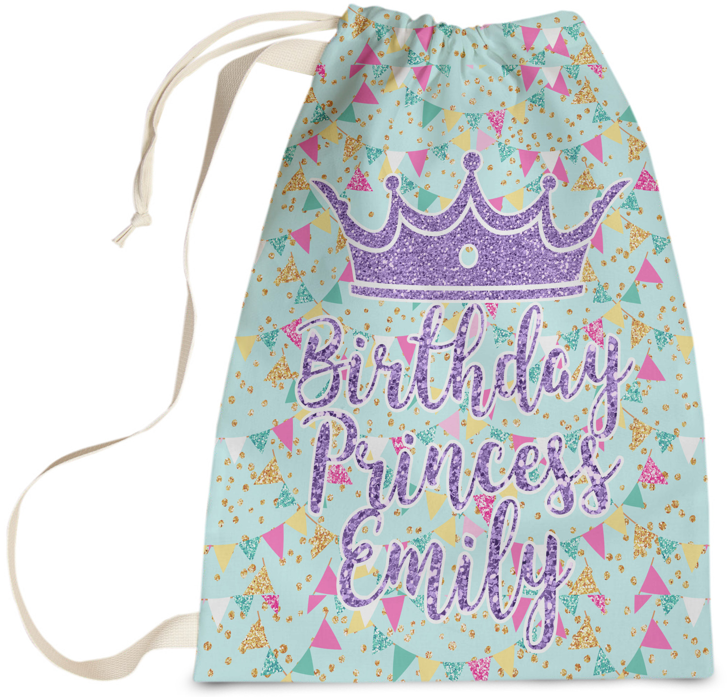 This design is bursting with fun! The background is a cool mint with brightly colored banners and confetti. The main graphic is a quote that says "Birthday Princess [Name Here]." This quote is filled with a fun glittery texture and can easily be changed to other fun patterns and colors.