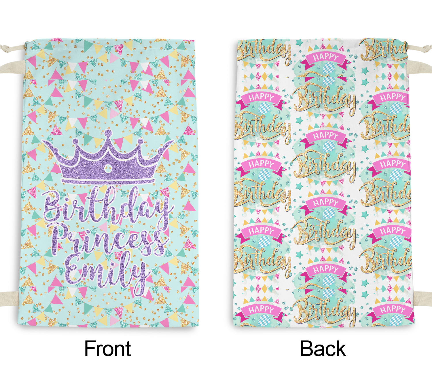 This design is bursting with fun! The background is a cool mint with brightly colored banners and confetti. The main graphic is a quote that says "Birthday Princess [Name Here]." This quote is filled with a fun glittery texture and can easily be changed to other fun patterns and colors.