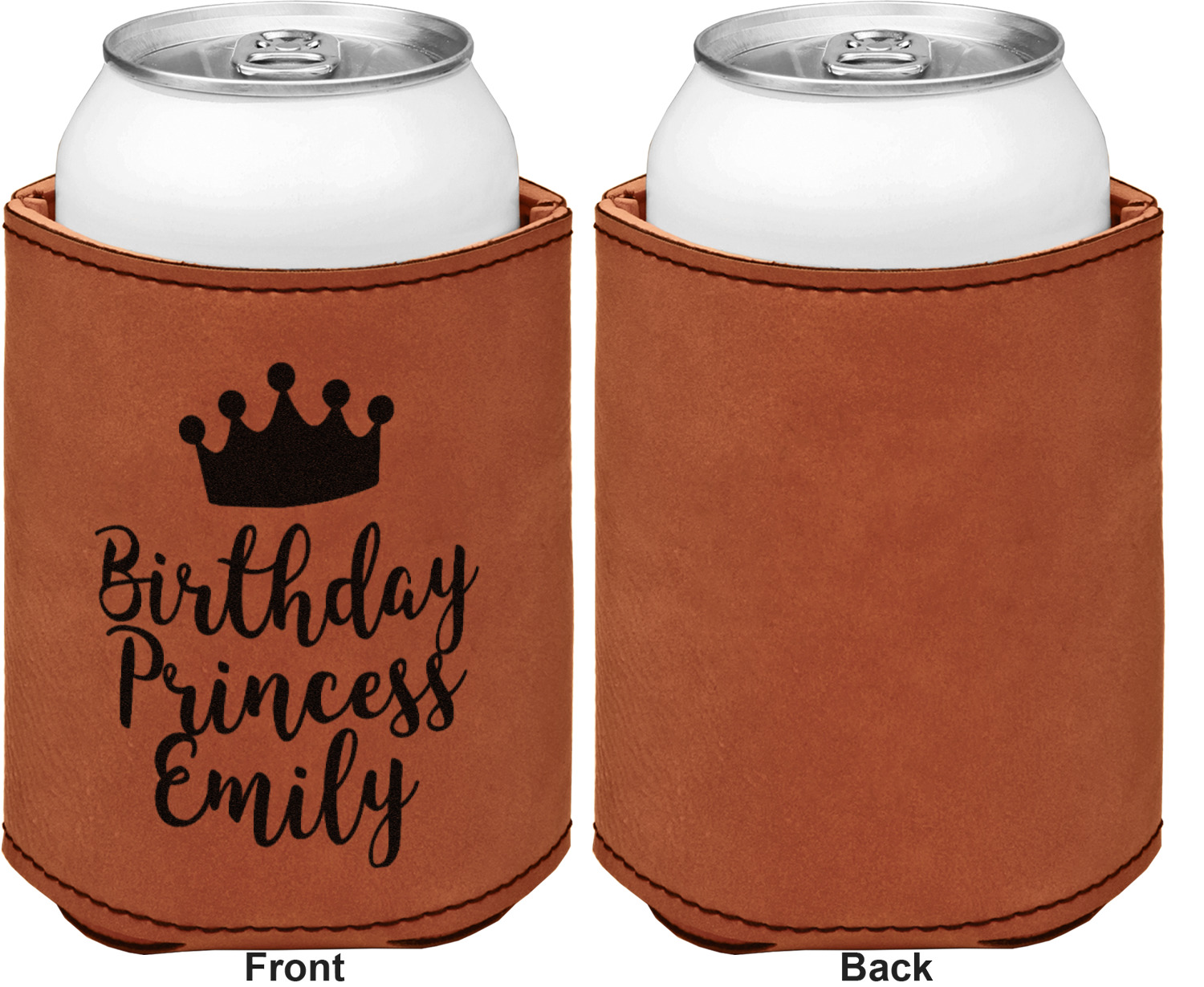 This can sleeve is made from a cognac-brown leatherette and stitched with a sturdy, black thread. A slim padding lines the inside of your can sleeve to allow for a better fit once your drink is inserted. The sleeve itself measures at 4 by 4.5 inches, allowing this custom can sleeve to accommodate most canned drinks. Your personalized design can be engraved on the front and back, or solely the front. When laser-engraved, your design appears as a black coloration which contrasts the leatherette nicely.