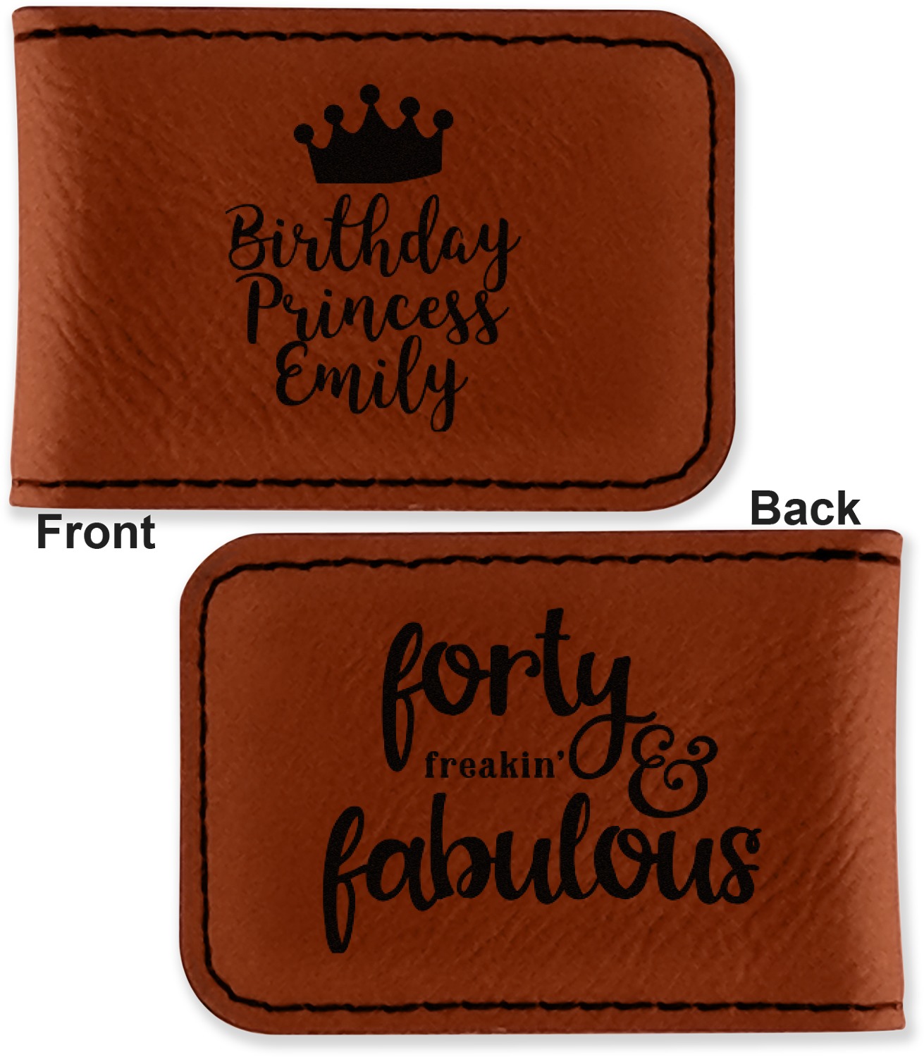 Your money clip will be laser engraved so that the design you choose will come out black. Find a fun graphic, monogram, or font to use to personalize your money clip either on just the front or the front and the back.