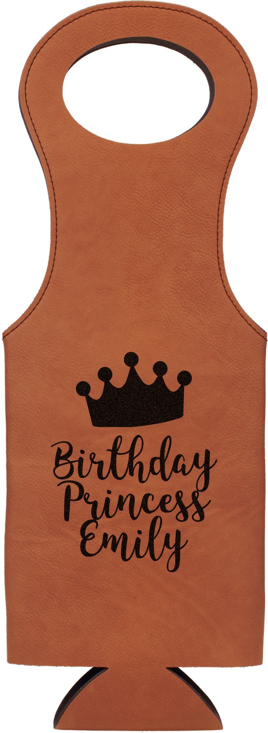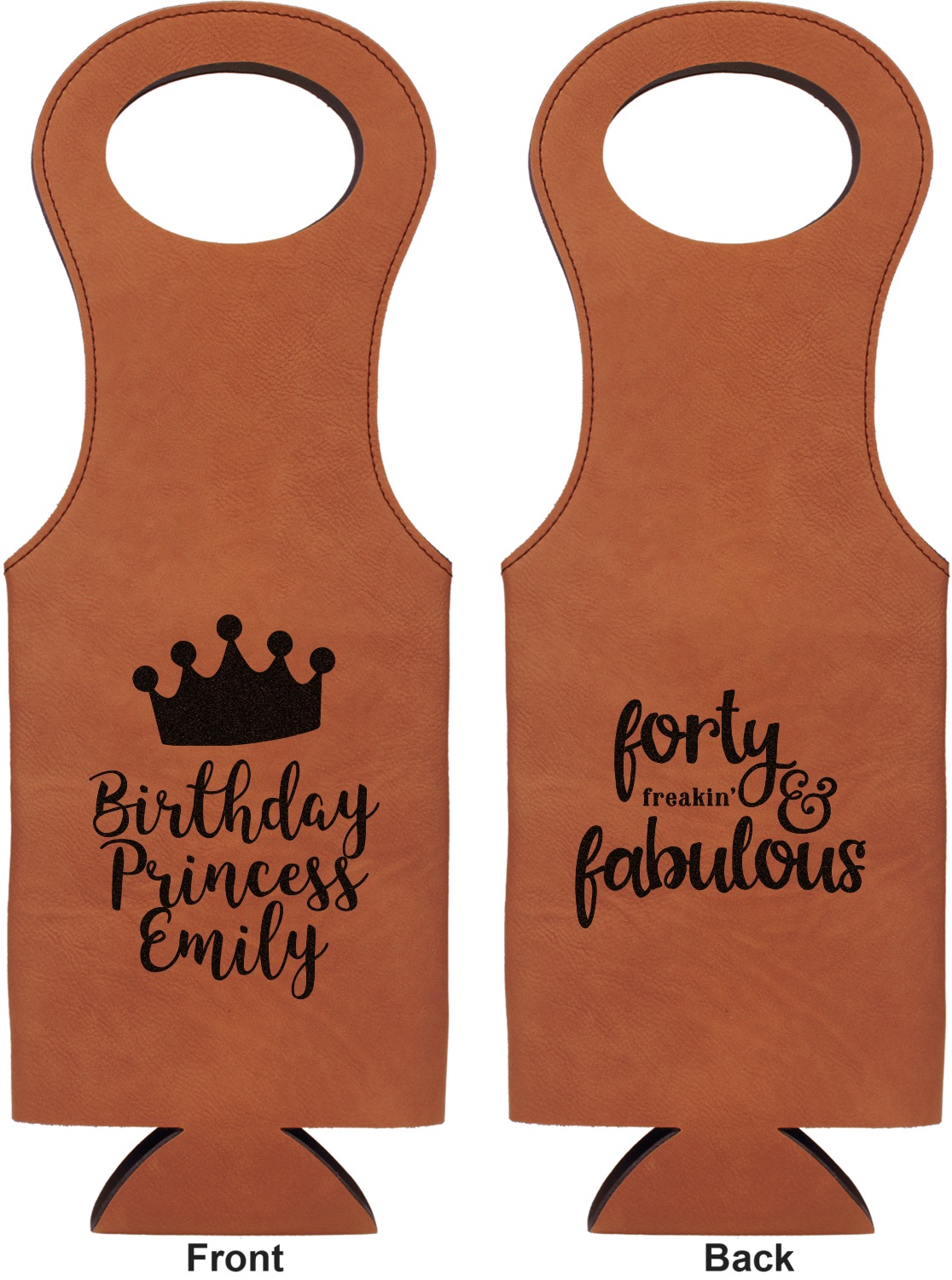 This wine carrier is made from a stunning leatherette, in a cognac-brown color. Strong, black stitching lines the sides of your wine bottle bag and provides extra durability. The interior is lined with a padded, black material to allow for a snug fit once your bottle is placed inside. At the top of this wine gift bag, you'll find two oval shaped handles that elegantly complements the rest of the bag's style. We provide you with the option of laser-engraving the front, or the front and back of your new personalized wine bag!