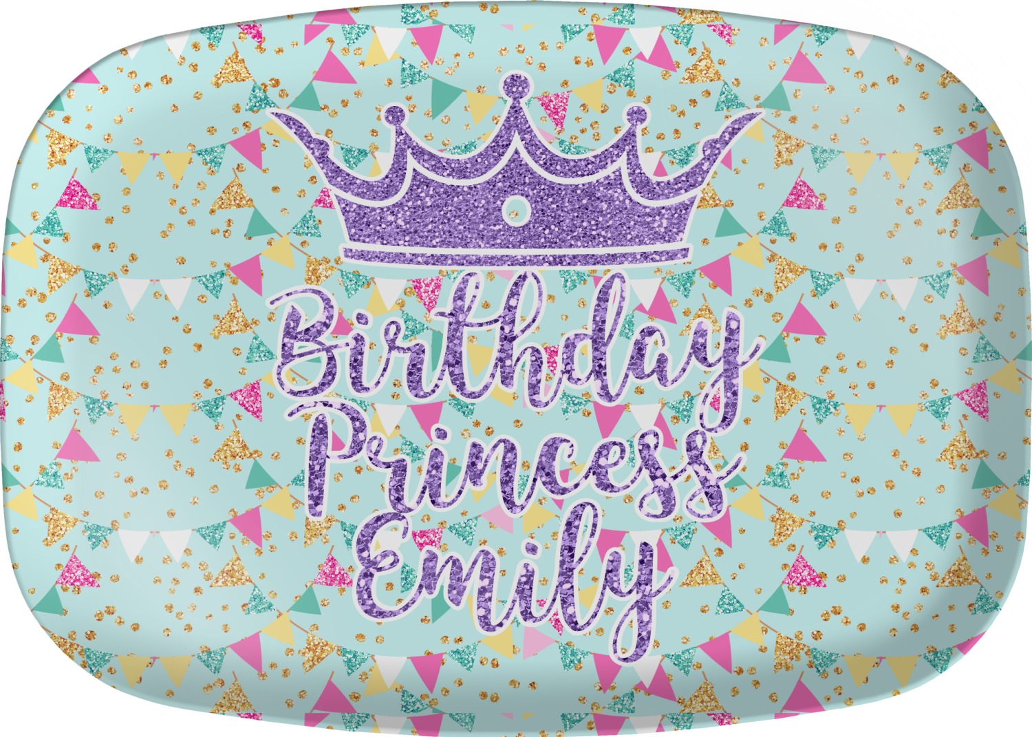 This design is bursting with fun! The background is a cool mint with brightly colored banners and confetti. The main graphic is a quote that says "Birthday Princess [Name Here]." This quote is filled with a fun glittery texture and can easily be changed to other fun patterns and colors.